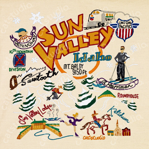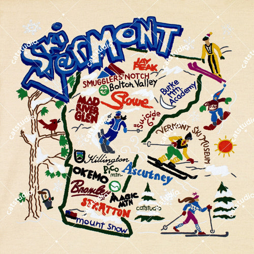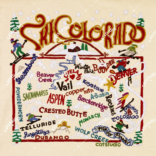 Our ski home decor features original artwork that is as unique as a fresh blanket of powder snow (pun intended). Choose from our ski Vermont hand-embroidered throw pillows, ski Tahoe fine art prints, or Ski-themed Colorado art prints.
