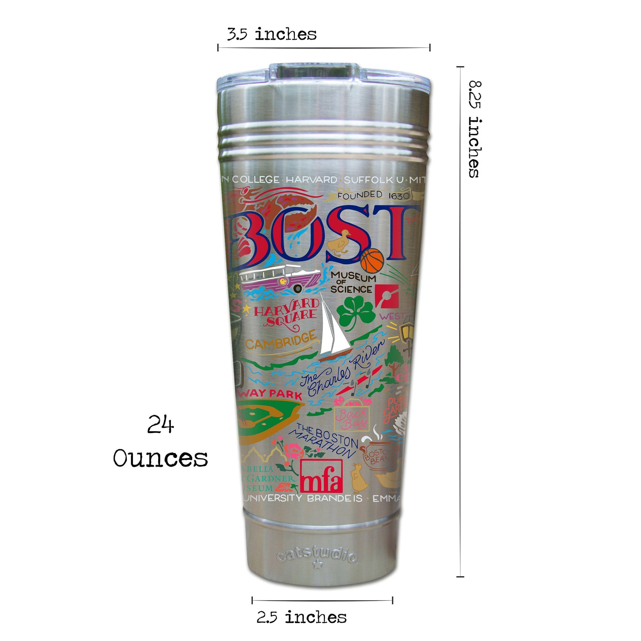 This original design celebrates Bean Town - the City of Boston.Our original art is now available to bring along on all your on-the-go adventures. This triple-walled 24 ounce thermal tumbler amazingly keeps beverages HOT for 4 hours and COLD for 6 hours. Add ice for up to 12 hours of cool sipping! Features a thoughtfully-engineered magnetic closure and a non-slip bottom to prevent spills and wet marks on surfaces. Innovation at its finest. Yippee!