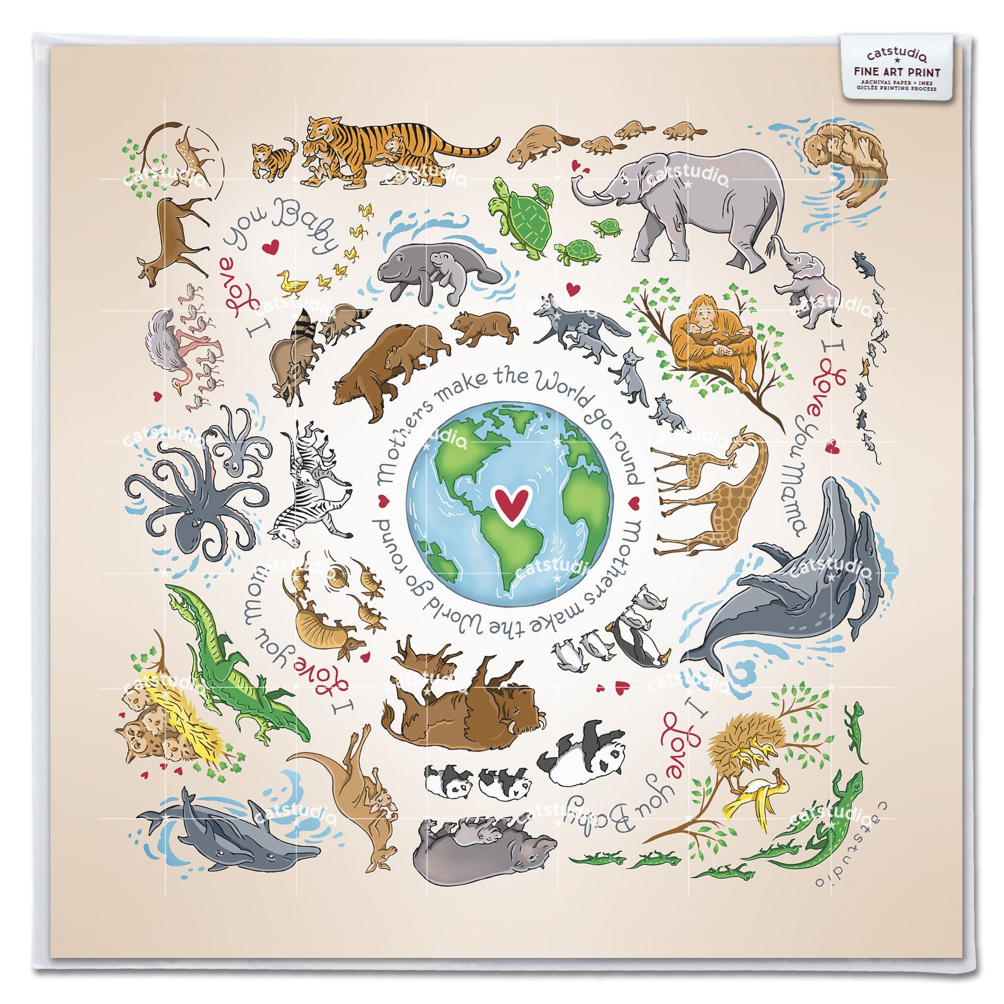 This original art celebrates Mothers from around the globe. With their adorable babies in tow, this menagerie of doting Mamas makes the perfect gift for Mother's Day, Birthday, Baby Shower, or any other occasion to celebrate a Mom in your life!