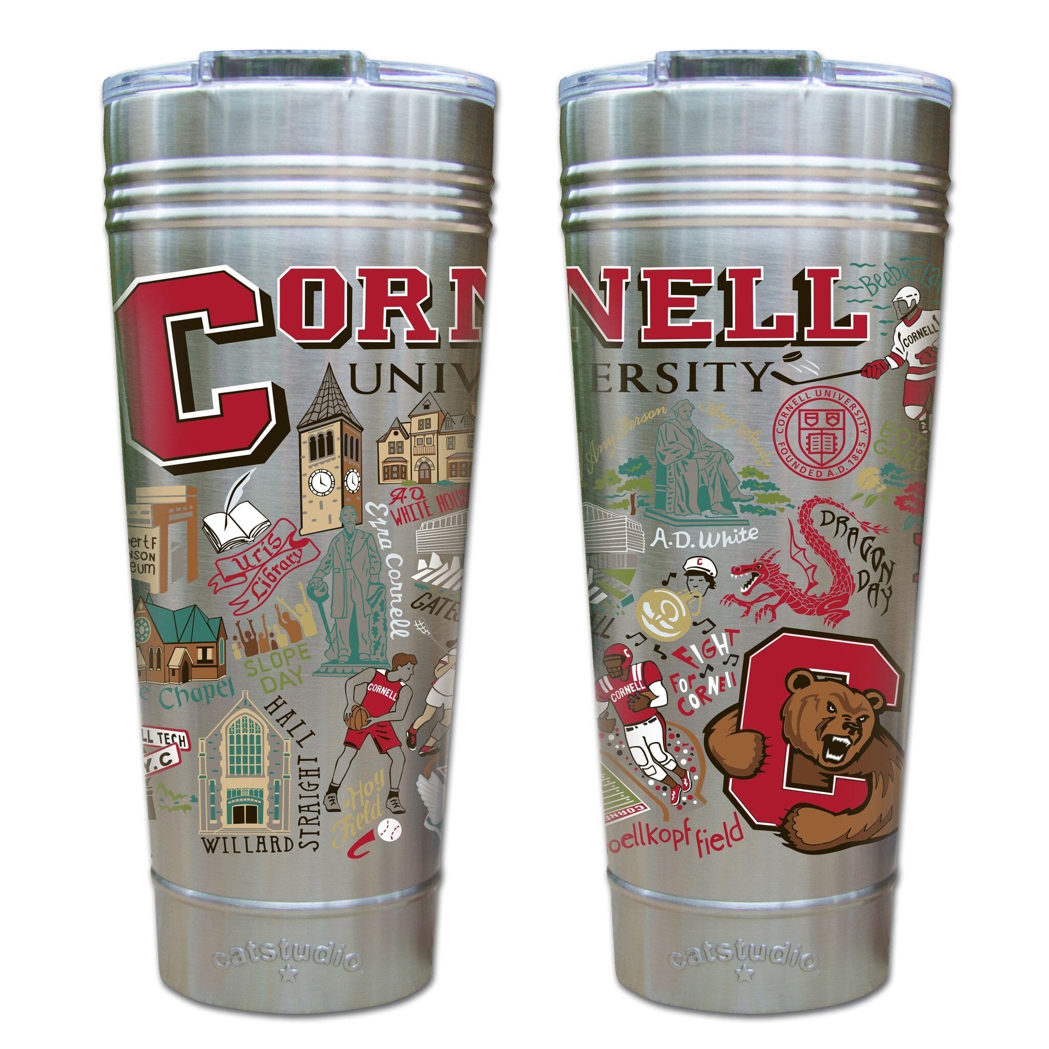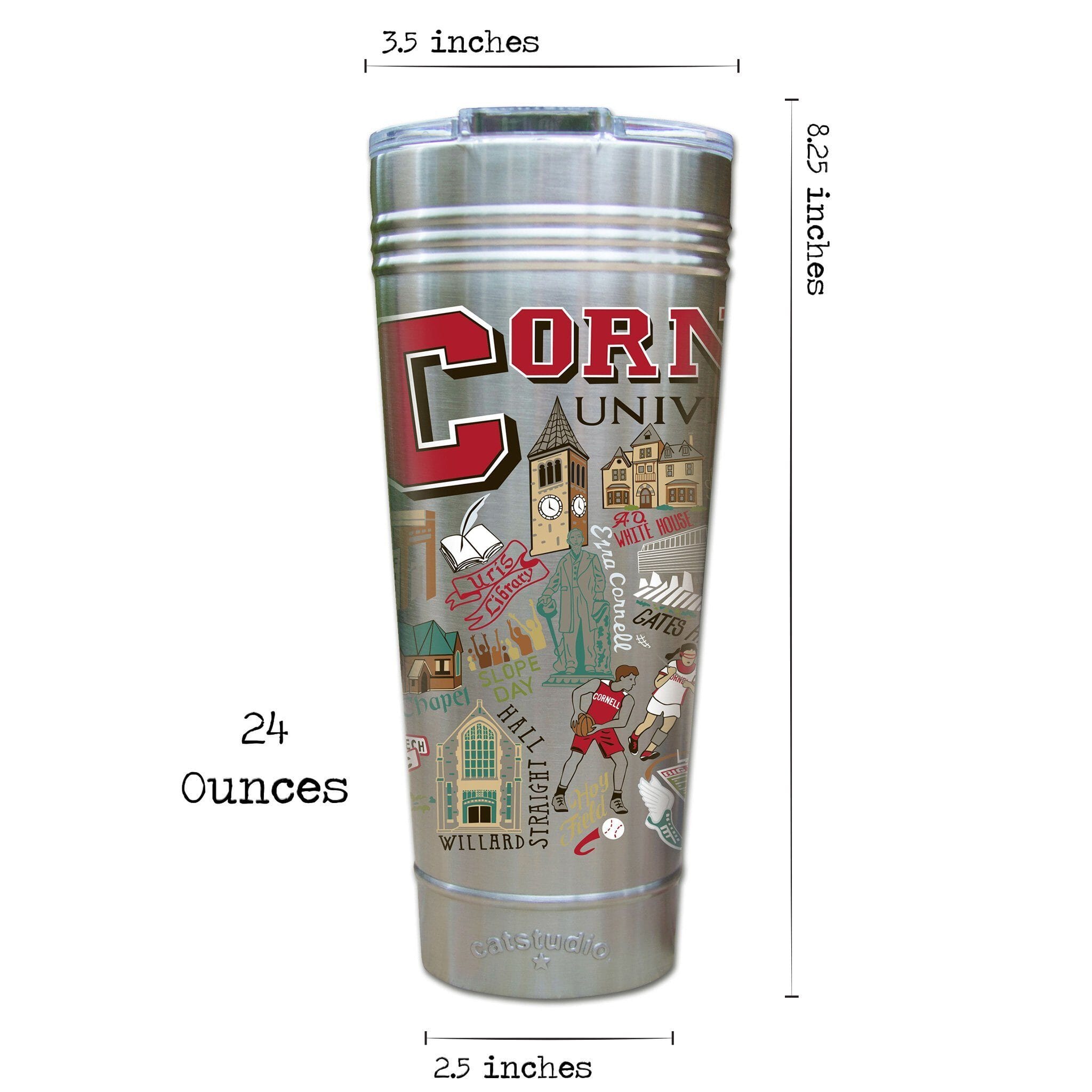 This original design celebrates Cornell University. Go Big Red!Our original art is now available to bring along on all your on-the-go adventures. This triple-walled 24 ounce thermal tumbler amazingly keeps beverages HOT for 4 hours and COLD for 6 hours. Add ice for up to 12 hours of cool sipping! Features a thoughtfully-engineered magnetic closure and a non-slip bottom to prevent spills and wet marks on surfaces. Innovation at its finest. Yippee!