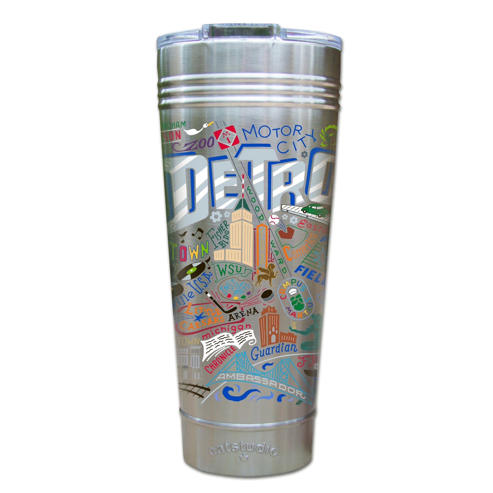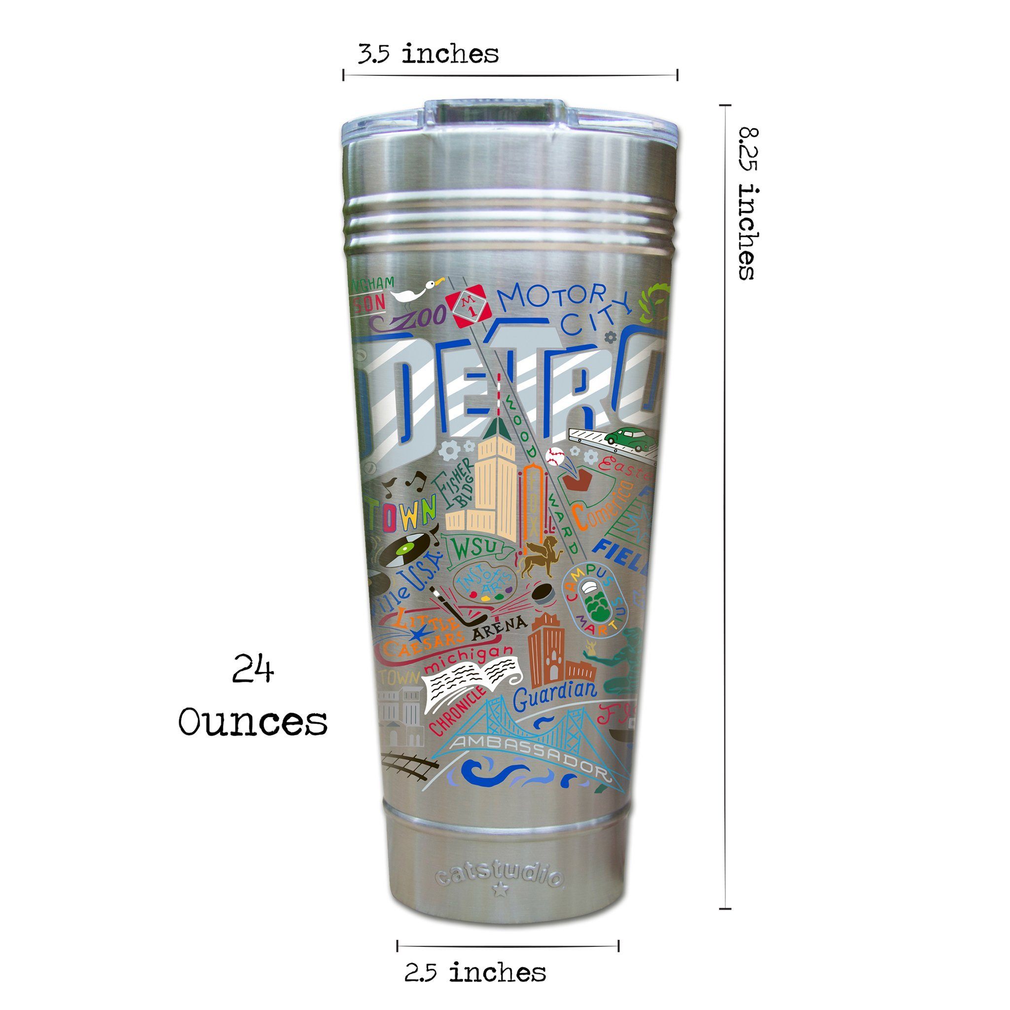This original design celebrates "Motor City"—Detroit, Michigan!Our original art is now available to bring along on all your on-the-go adventures. This triple-walled 24 ounce thermal tumbler amazingly keeps beverages HOT for 4 hours and COLD for 6 hours. Add ice for up to 12 hours of cool sipping! Features a thoughtfully-engineered magnetic closure and a non-slip bottom to prevent spills and wet marks on surfaces. Innovation at its finest. Yippee!