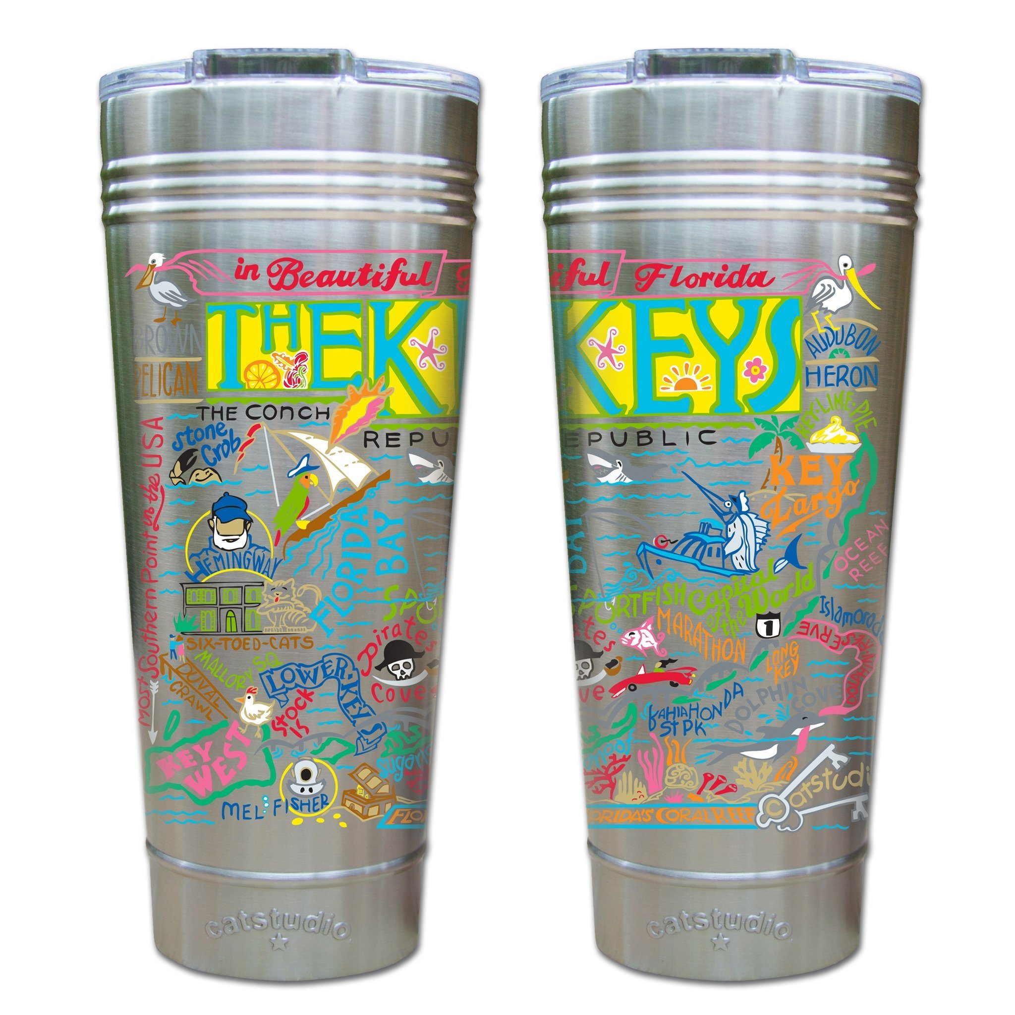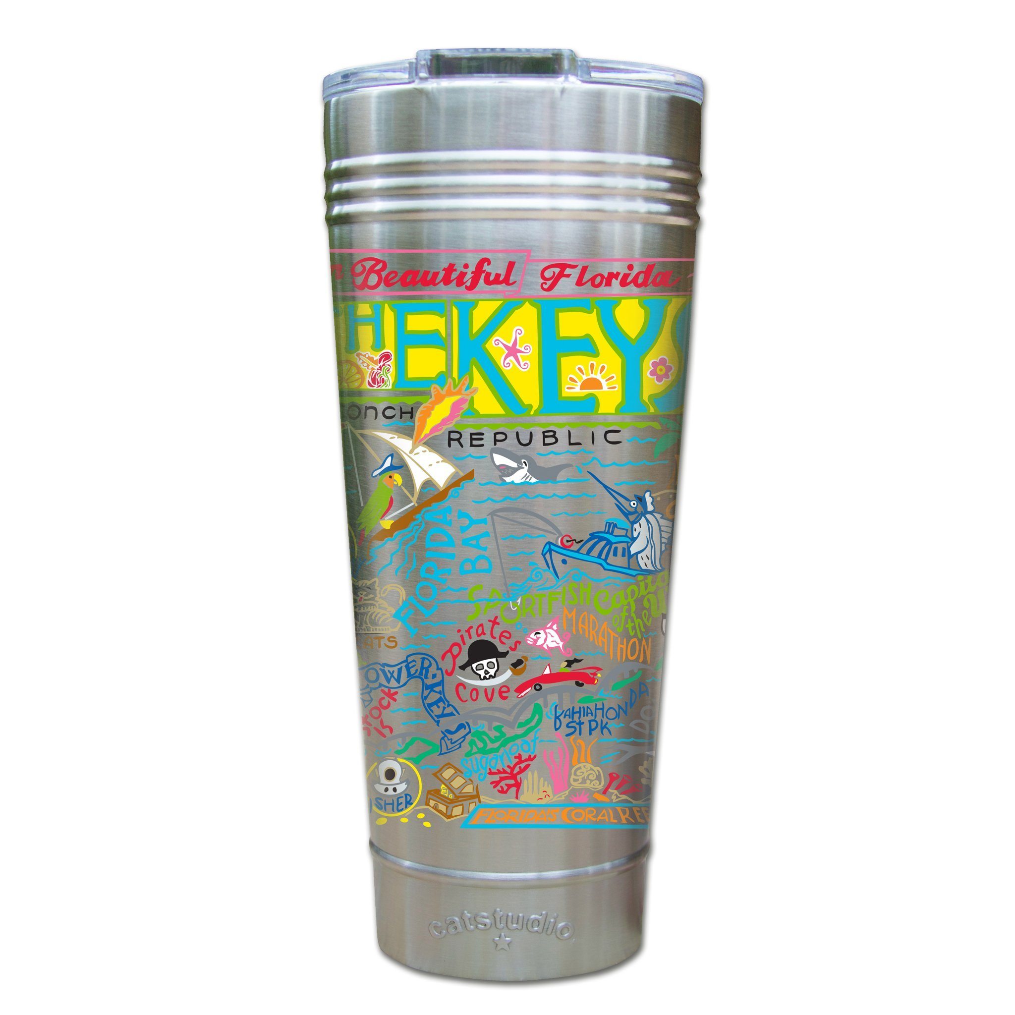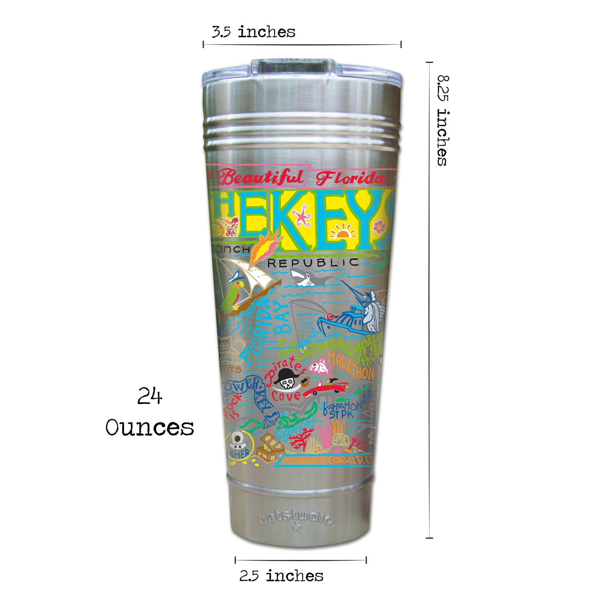 This original design celebrates The Conch Republic - the sunny Florida Keys.Our original art is now available to bring along on all your on-the-go adventures. This triple-walled 24 ounce thermal tumbler amazingly keeps beverages HOT for 4 hours and COLD for 6 hours. Add ice for up to 12 hours of cool sipping! Features a thoughtfully-engineered magnetic closure and a non-slip bottom to prevent spills and wet marks on surfaces. Innovation at its finest. Yippee!