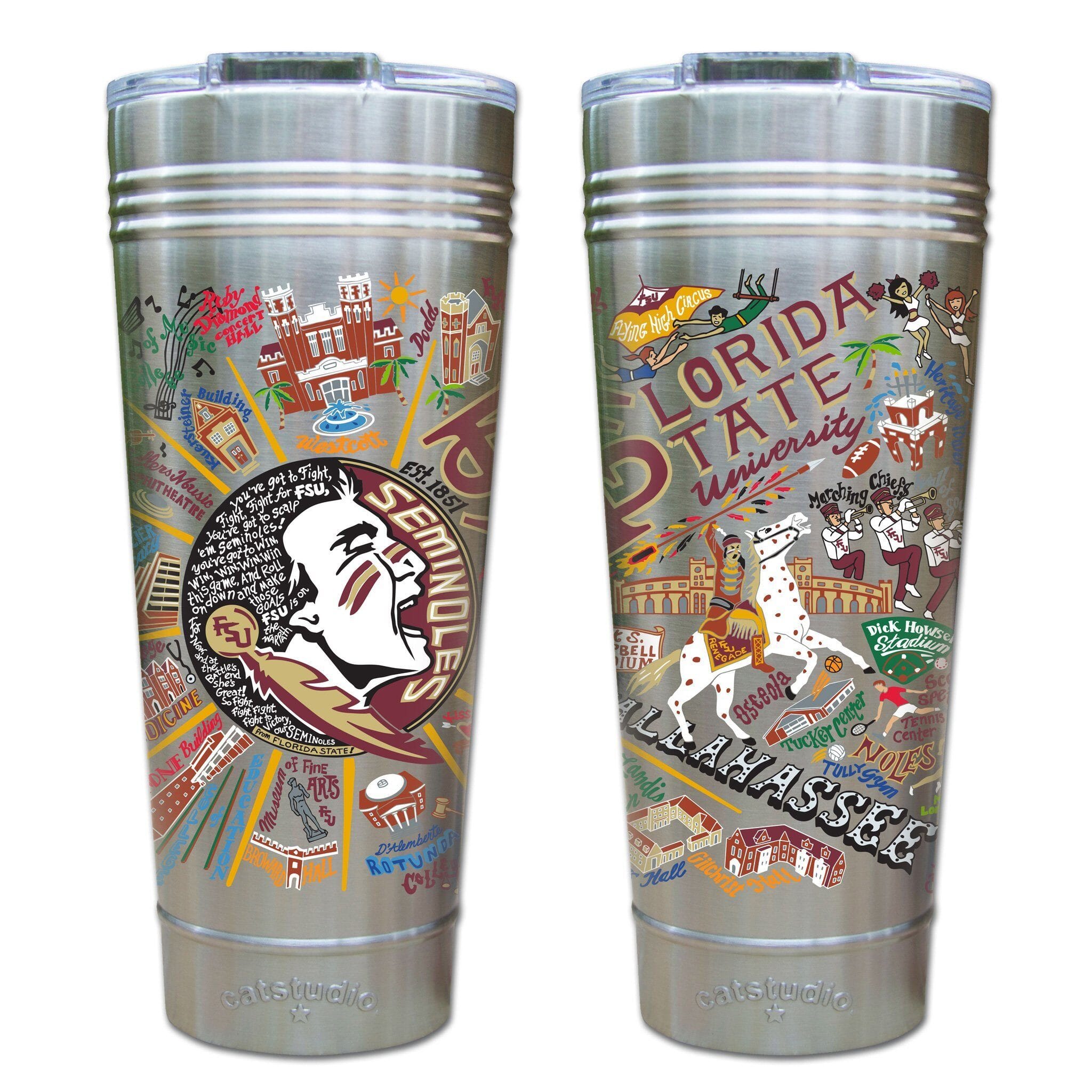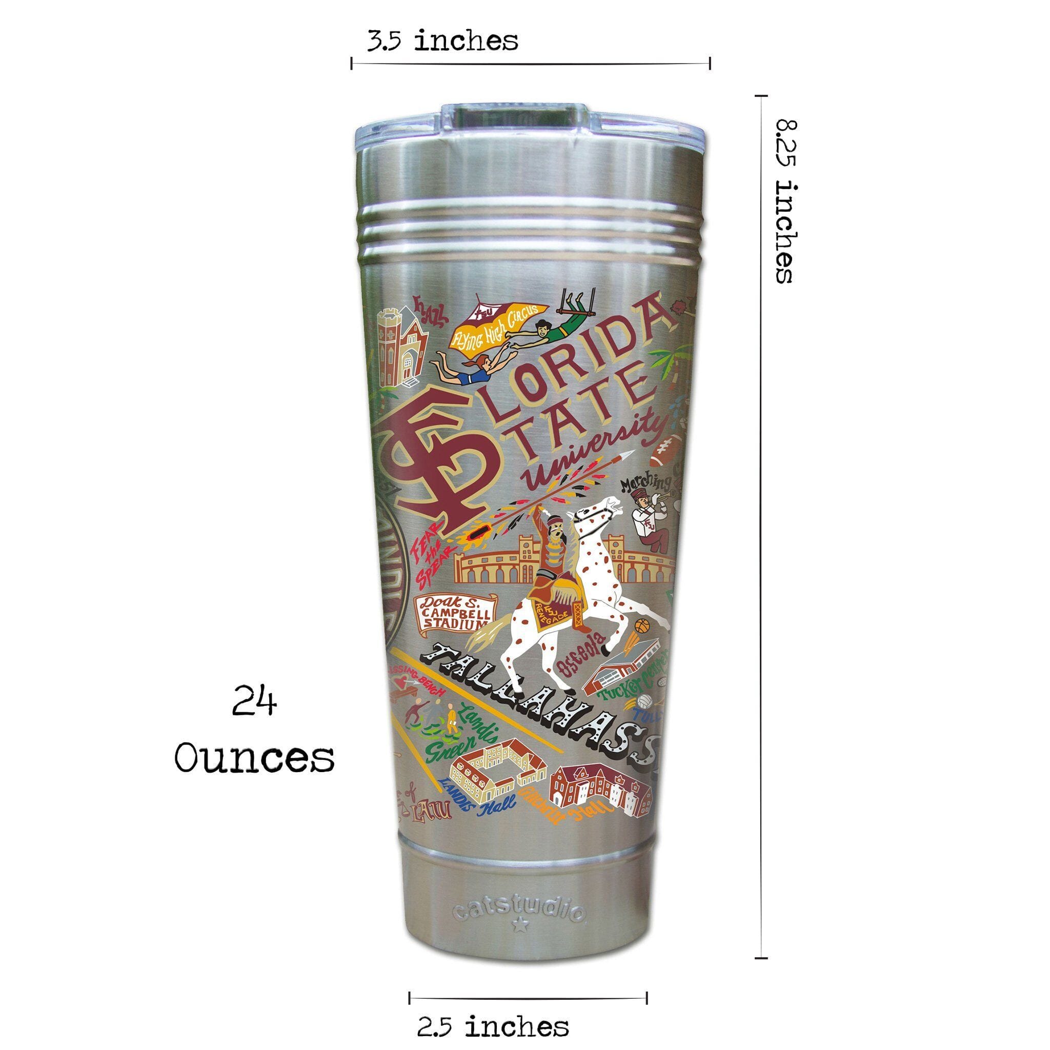 This original design celebrates Florida State. Go Seminoles!Our original art is now available to bring along on all your on-the-go adventures. This triple-walled 24 ounce thermal tumbler amazingly keeps beverages HOT for 4 hours and COLD for 6 hours. Add ice for up to 12 hours of cool sipping! Features a thoughtfully-engineered magnetic closure and a non-slip bottom to prevent spills and wet marks on surfaces. Innovation at its finest. Yippee!
