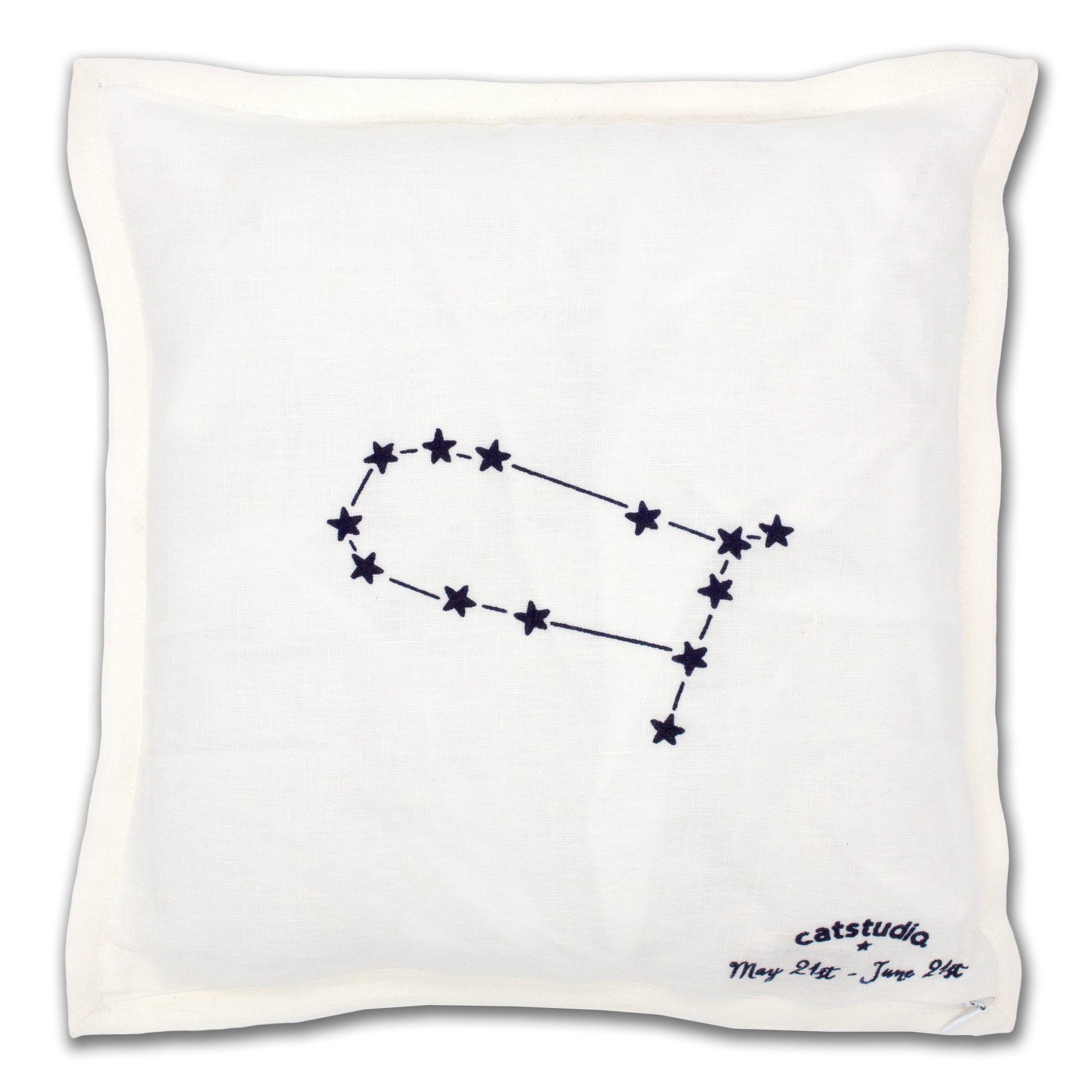 This pillow is entirely EMBROIDERED by HAND on 100% Fine Linen with vibrant colors plus traditional silver and gold Zari thread. Amazingly, it can take 8+ hours to embroider one pillow! It is also unique in nature since each artisan incorporates a certain flair to their work, and every piece is signed on the tag. Created on cream linen background, accented with flange, and finished with a zipper closure. Each pillow even has a constellation and astrological date detail printed on the back. 12x12 inches.