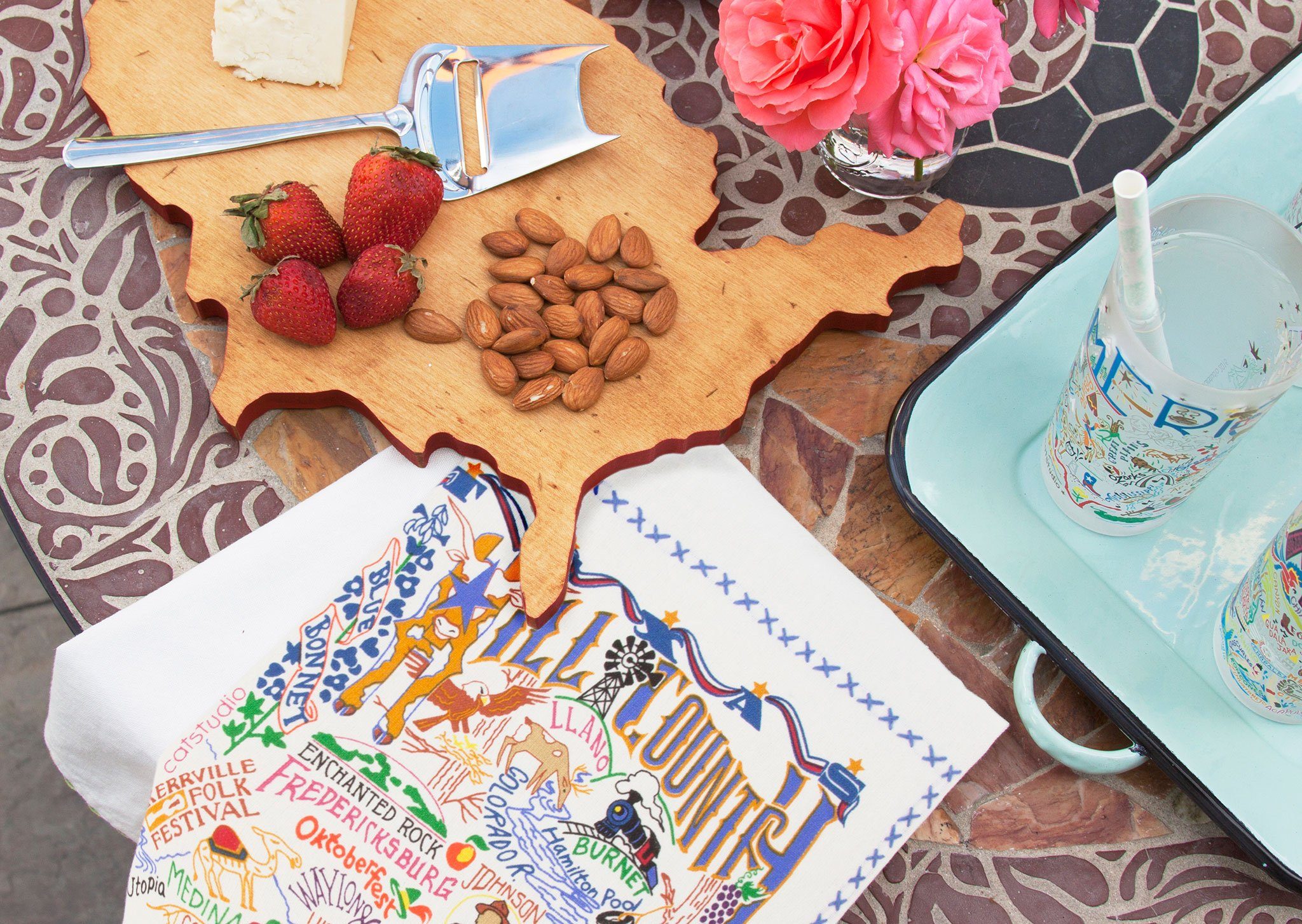 I love, love, love this Hill Country dish towel! It has it all! From Enchanted Rock to the Kerrville Folk Festival started by Peter Stogey, The beautiful bluebonnet trail, and our favorite whistle stop Leukenbach, it represents all the best of our neck of the woods. Beautifully designed!
