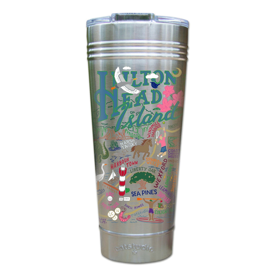 This original design celebrates the popular vacation spot - Hilton Head, South Carolina!Our original art is now available to bring along on all your on-the-go adventures. This triple-walled 24 ounce thermal tumbler amazingly keeps beverages HOT for 4 hours and COLD for 6 hours. Add ice for up to 12 hours of cool sipping! Features a thoughtfully-engineered magnetic closure and a non-slip bottom to prevent spills and wet marks on surfaces. Innovation at its finest. Yippee!