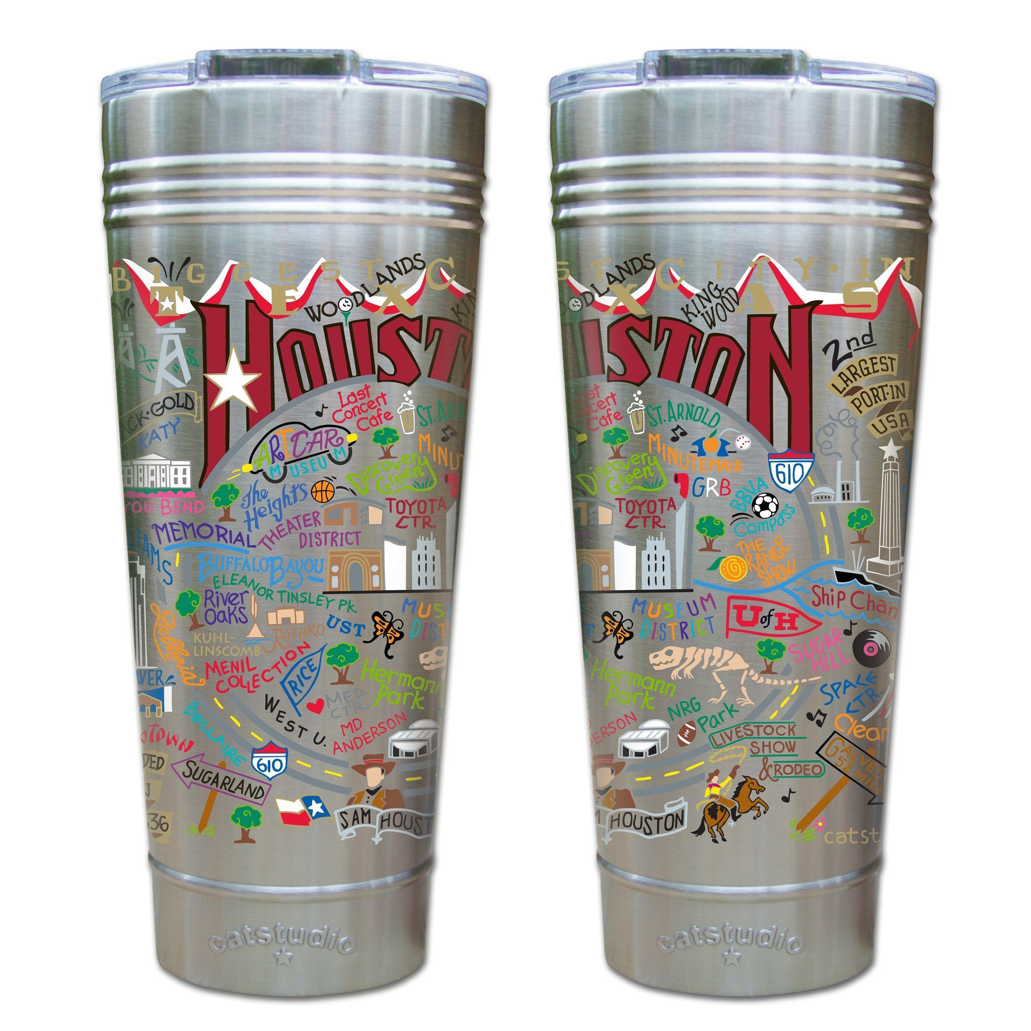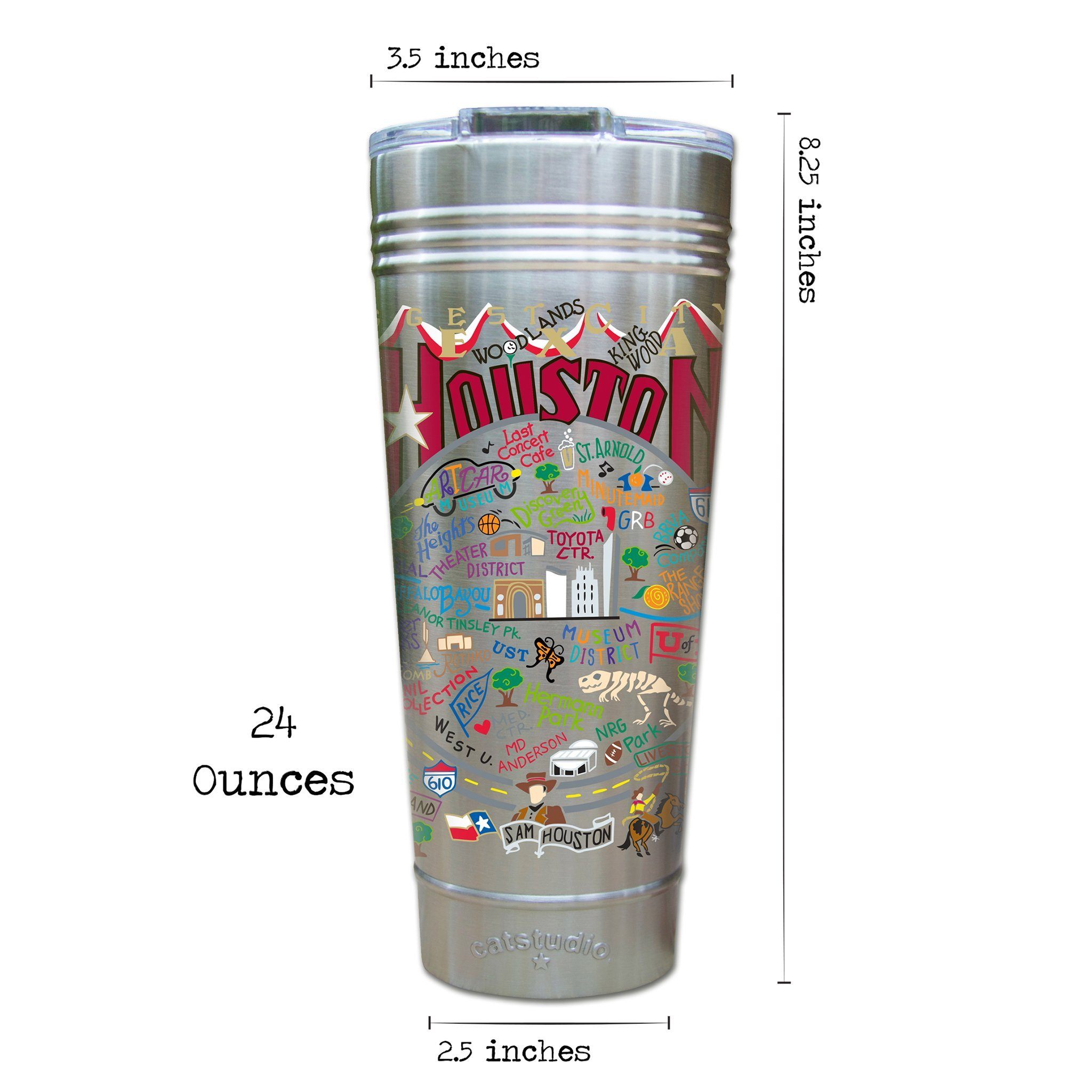 Rice University - Art Car Parade - Museum of Fine Arts...! Two loops surrounding it! This original design celebrates the vibrant City of Houston with over-the-top detail & charm!Our original art is now available to bring along on all your on-the-go adventures. This triple-walled 24 ounce thermal tumbler amazingly keeps beverages HOT for 4 hours and COLD for 6 hours. Add ice for up to 12 hours of cool sipping! Features a thoughtfully-engineered magnetic closure and a non-slip bottom to prevent spills and wet marks on surfaces. Innovation at its finest. Yippee!