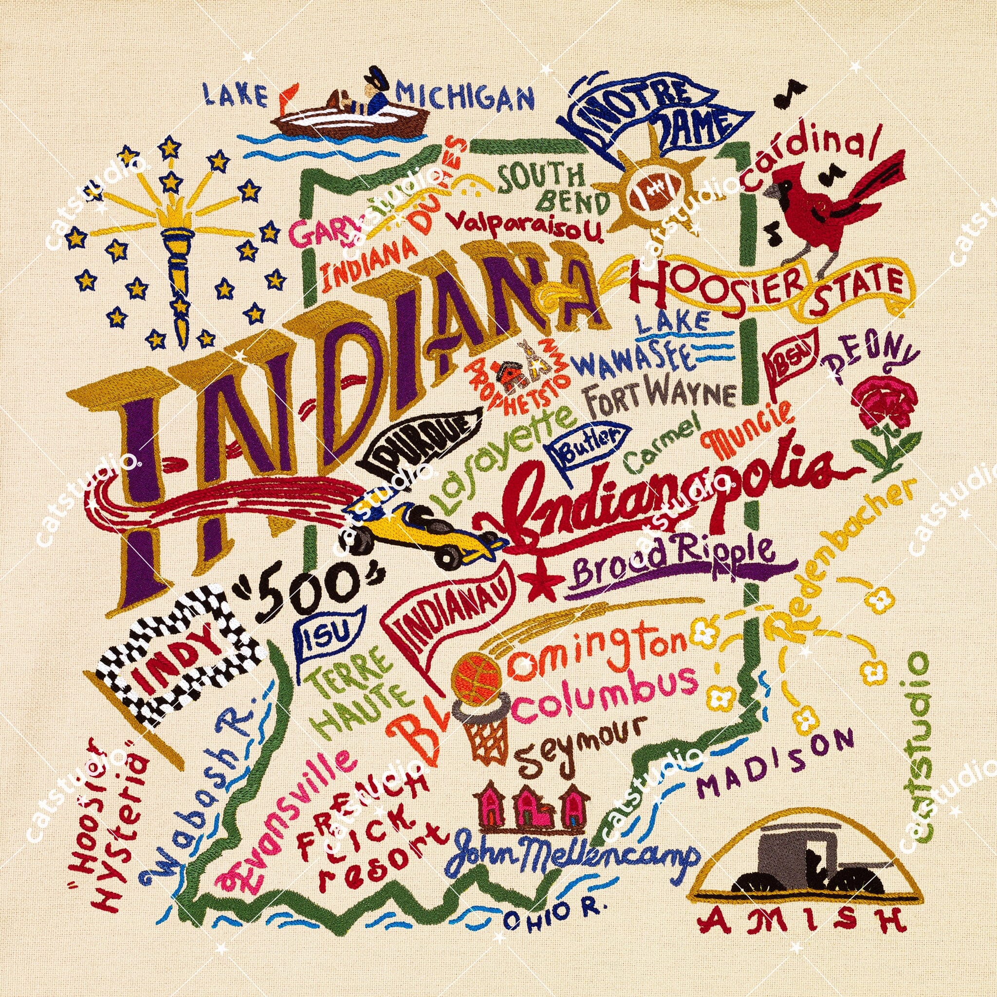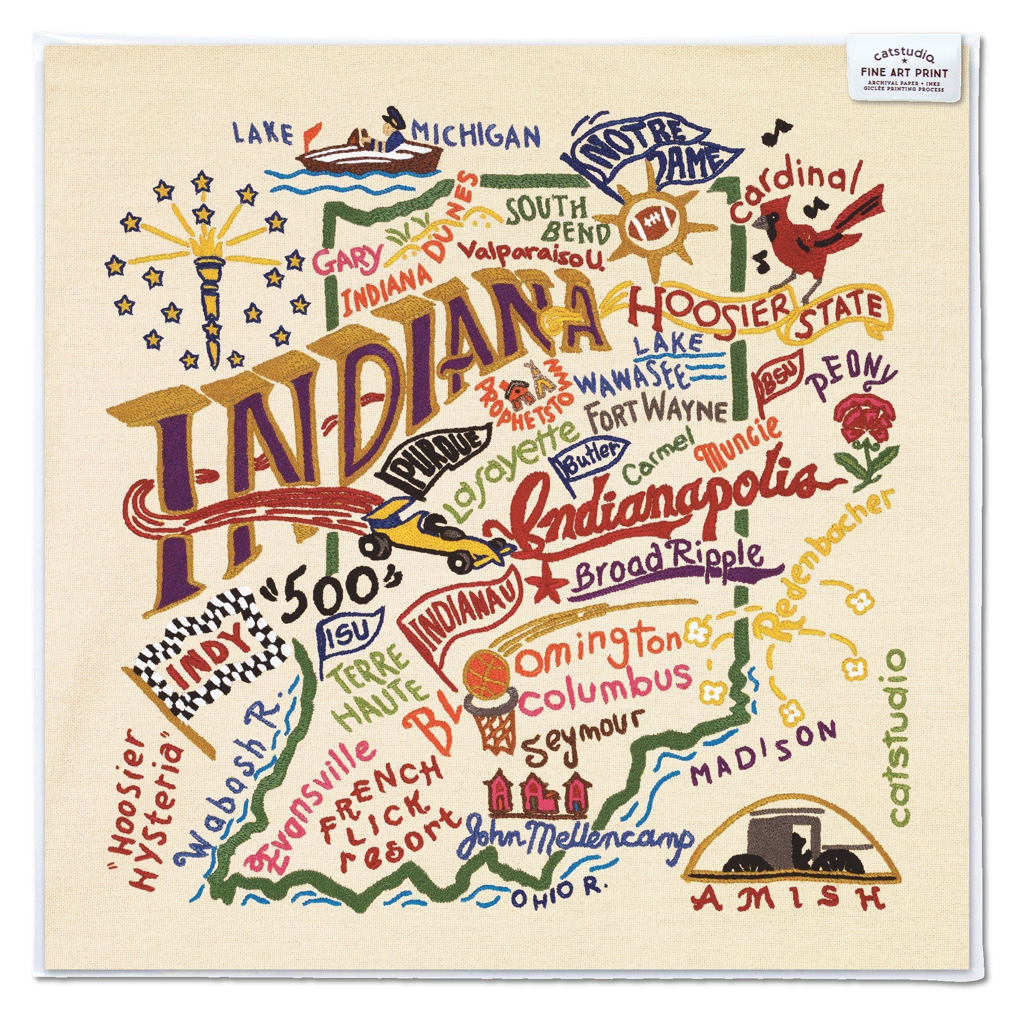 This original design celebrates the great state of Indiana, from Madison to Muncie to Lake Michigan!