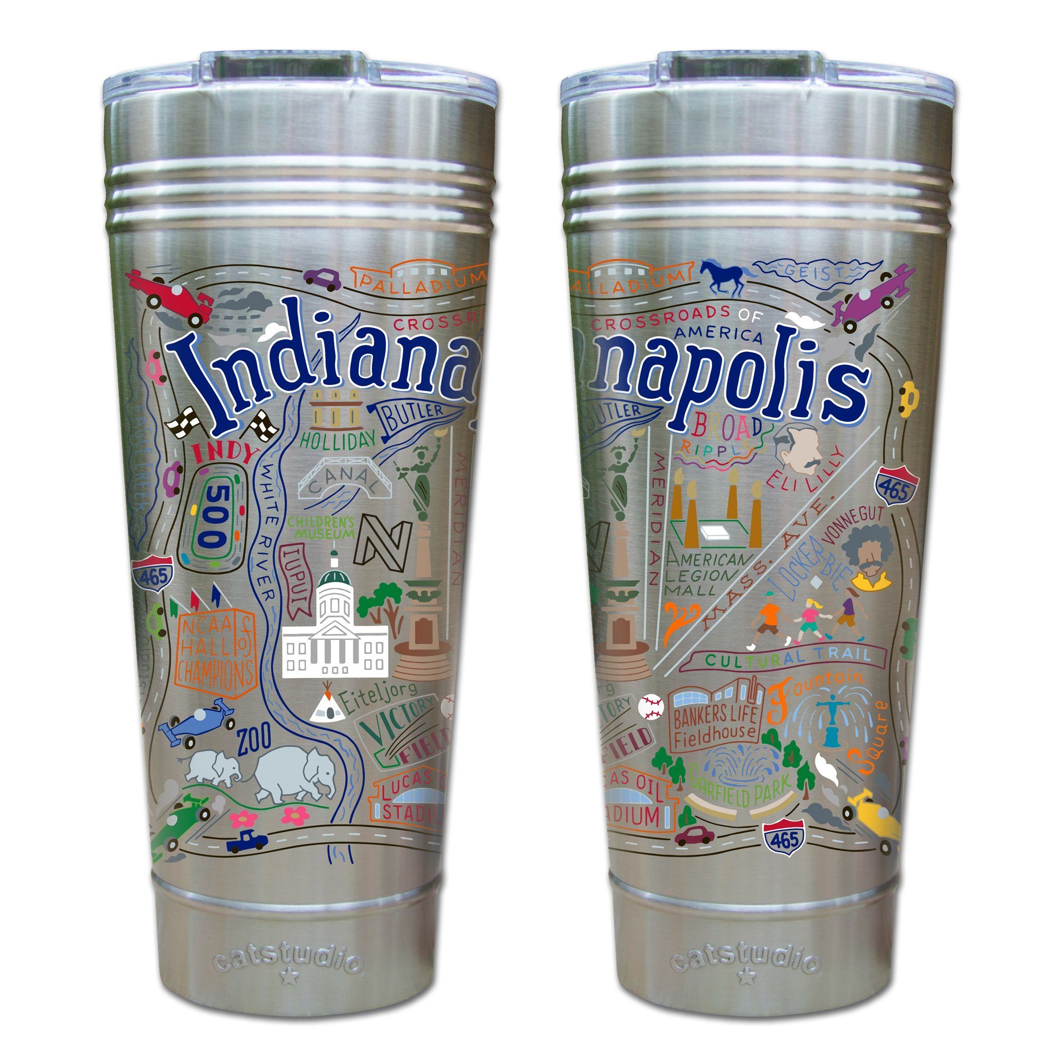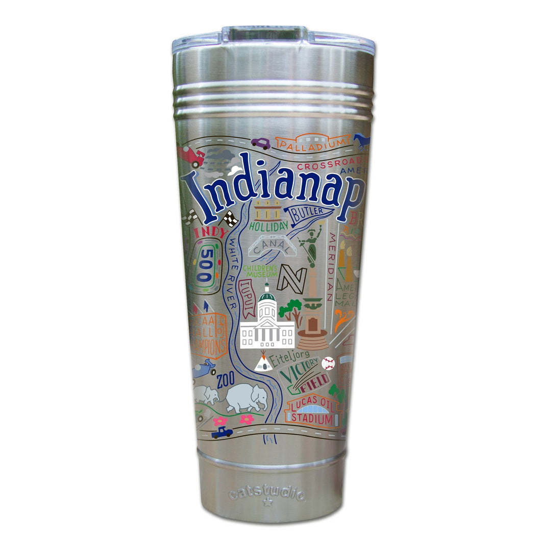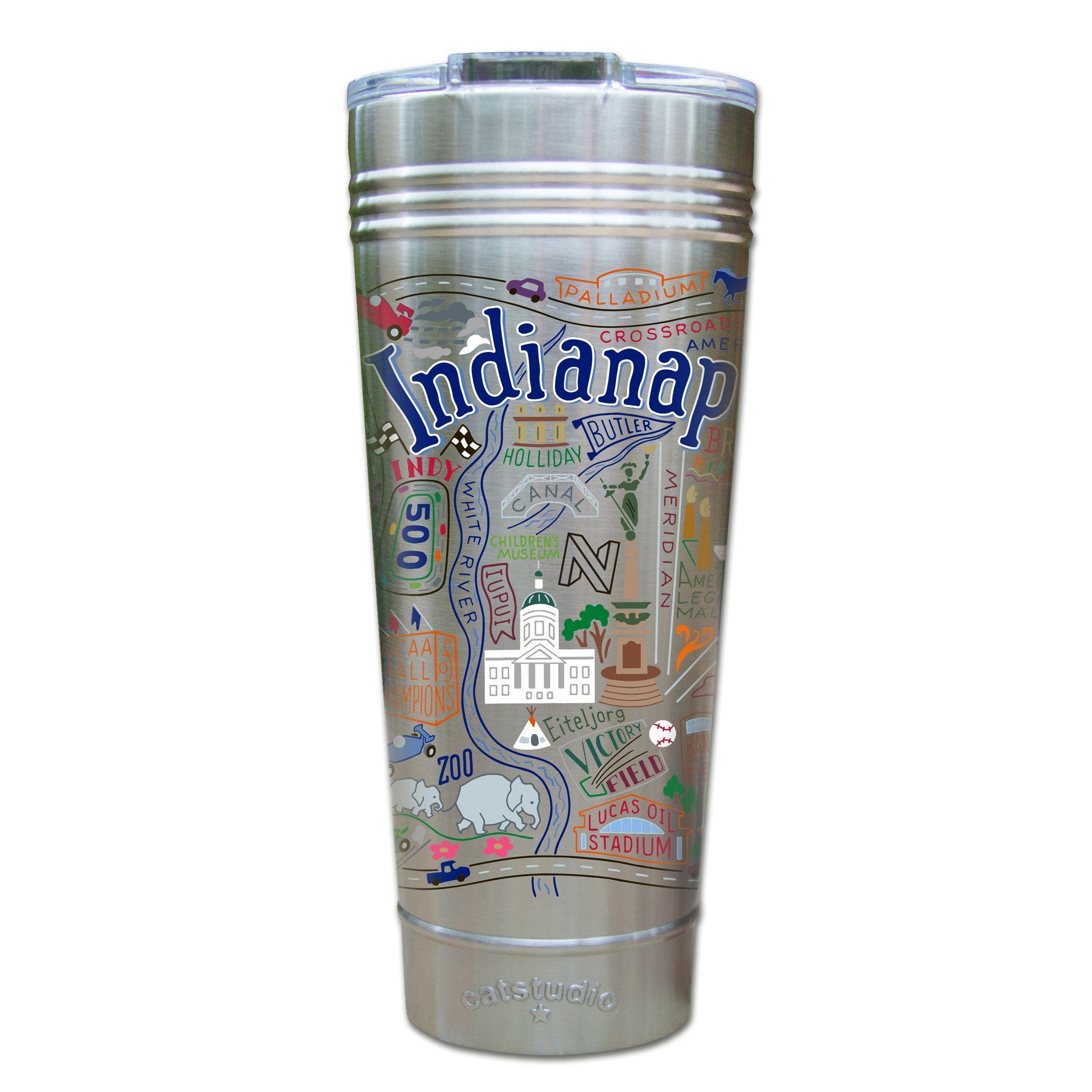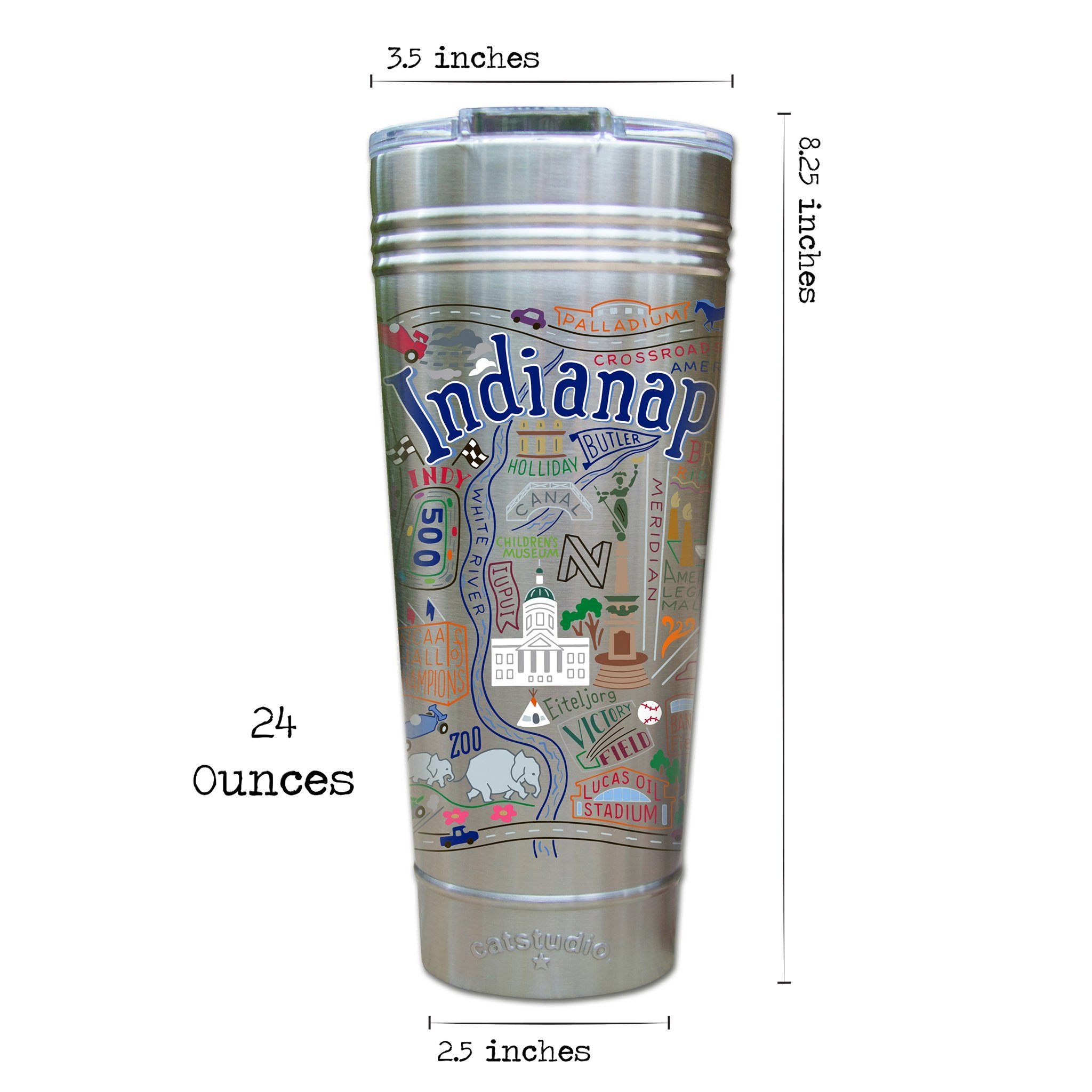 This original design celebrates Indianapolis, Indiana.Our original art is now available to bring along on all your on-the-go adventures. This triple-walled 24 ounce thermal tumbler amazingly keeps beverages HOT for 4 hours and COLD for 6 hours. Add ice for up to 12 hours of cool sipping! Features a thoughtfully-engineered magnetic closure and a non-slip bottom to prevent spills and wet marks on surfaces. Innovation at its finest. Yippee!