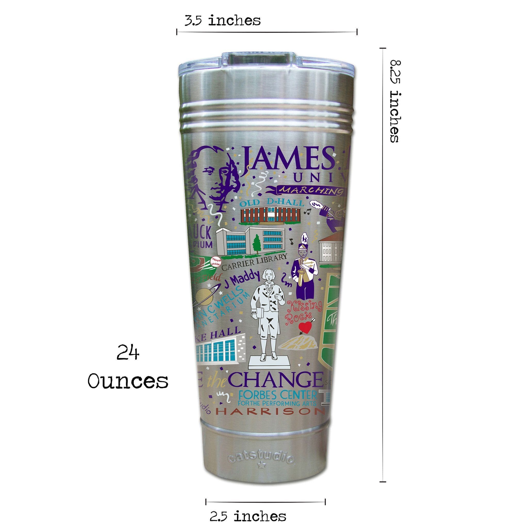 This original design celebrates James Madison University. Go Dukes!Our original art is now available to bring along on all your on-the-go adventures. This triple-walled 24 ounce thermal tumbler amazingly keeps beverages HOT for 4 hours and COLD for 6 hours. Add ice for up to 12 hours of cool sipping! Features a thoughtfully-engineered magnetic closure and a non-slip bottom to prevent spills and wet marks on surfaces. Innovation at its finest. Yippee!