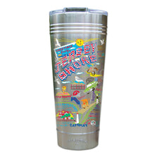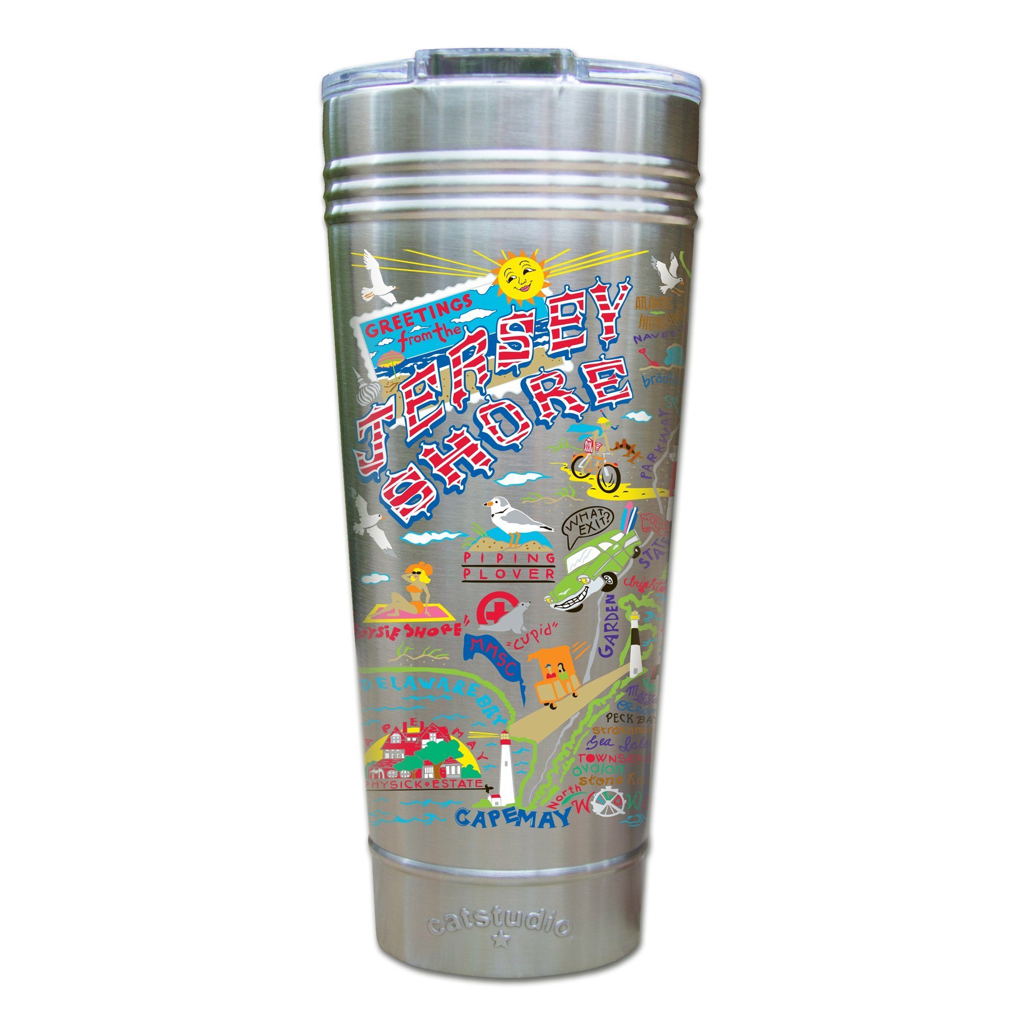 From Sandy Hook to Cape May - it's all there! This original design celebrates the beloved Jersey Shore.Our original art is now available to bring along on all your on-the-go adventures. This triple-walled 24 ounce thermal tumbler amazingly keeps beverages HOT for 4 hours and COLD for 6 hours. Add ice for up to 12 hours of cool sipping! Features a thoughtfully-engineered magnetic closure and a non-slip bottom to prevent spills and wet marks on surfaces. Innovation at its finest. Yippee!