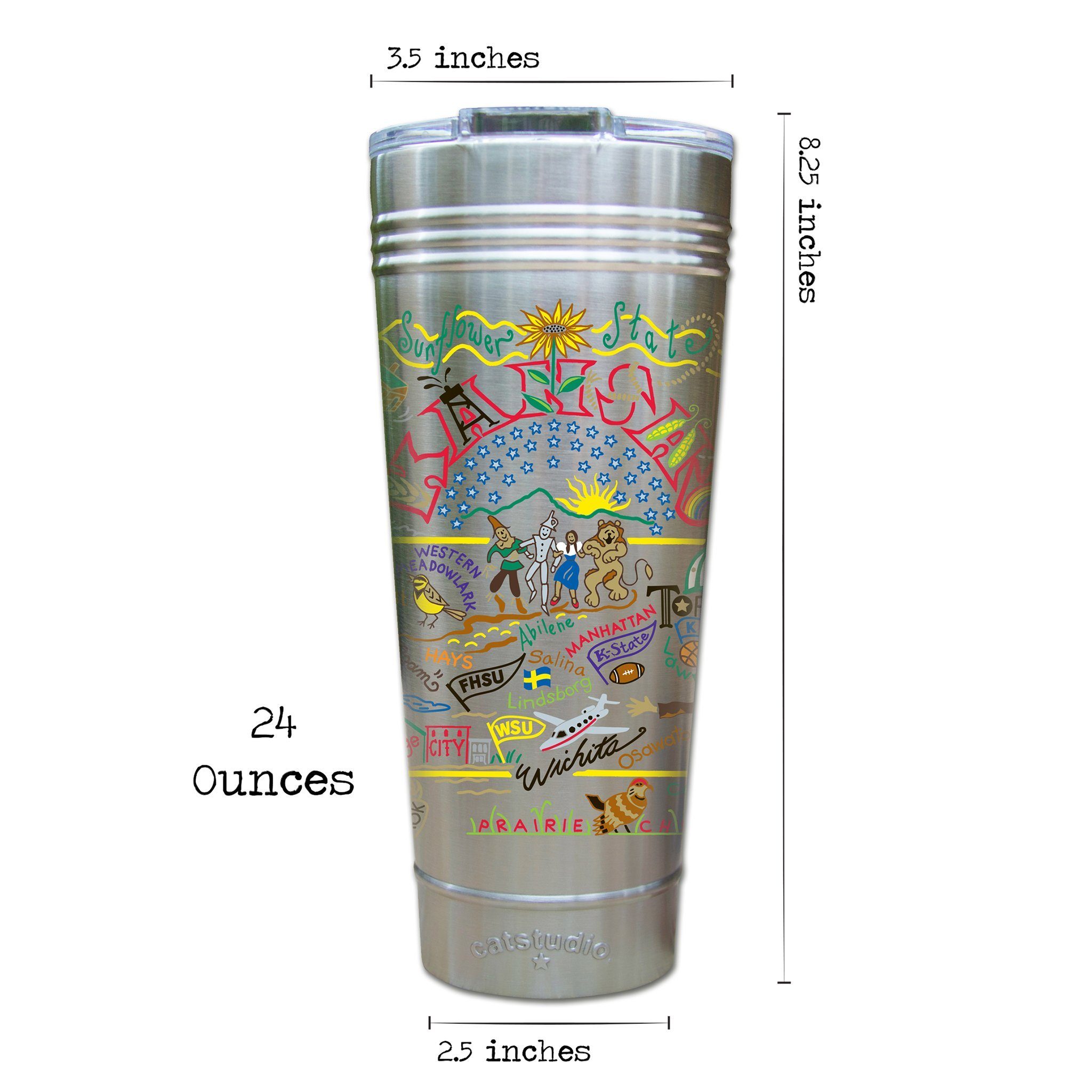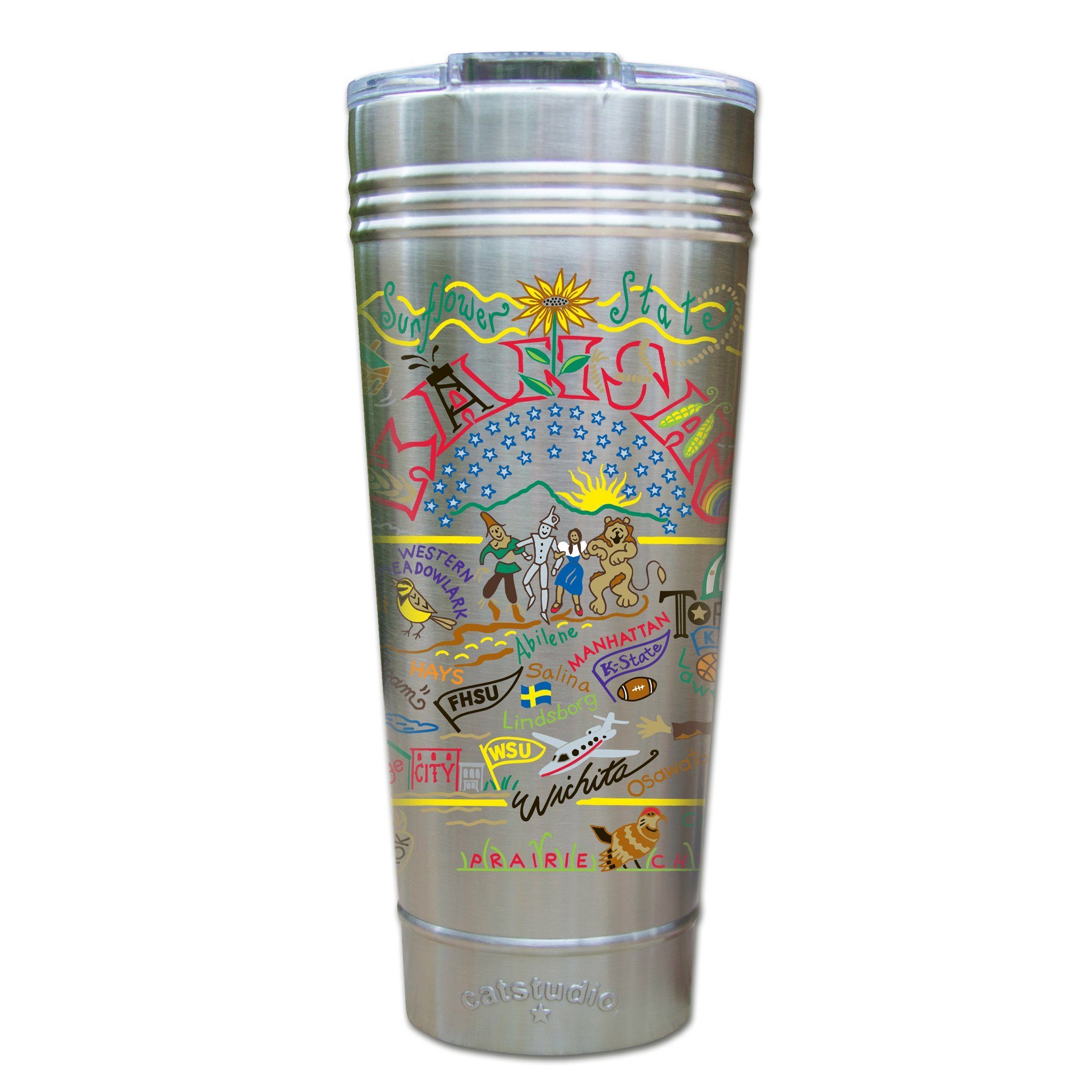 This original design celebrates the State of Kansas - from Wichita to Boot Hill to Topeka...!!!Our original art is now available to bring along on all your on-the-go adventures. This triple-walled 24 ounce thermal tumbler amazingly keeps beverages HOT for 4 hours and COLD for 6 hours. Add ice for up to 12 hours of cool sipping! Features a thoughtfully-engineered magnetic closure and a non-slip bottom to prevent spills and wet marks on surfaces. Innovation at its finest. Yippee!