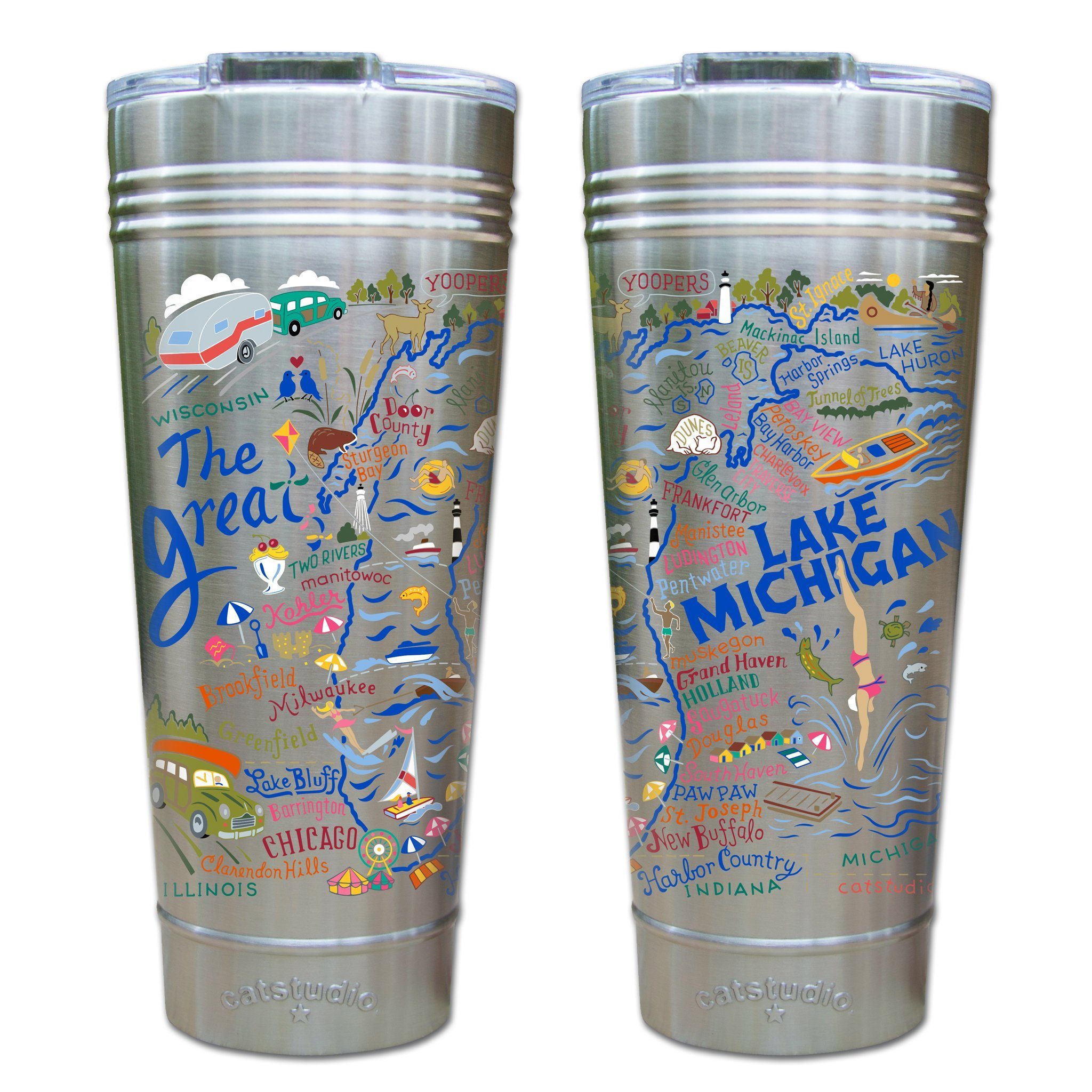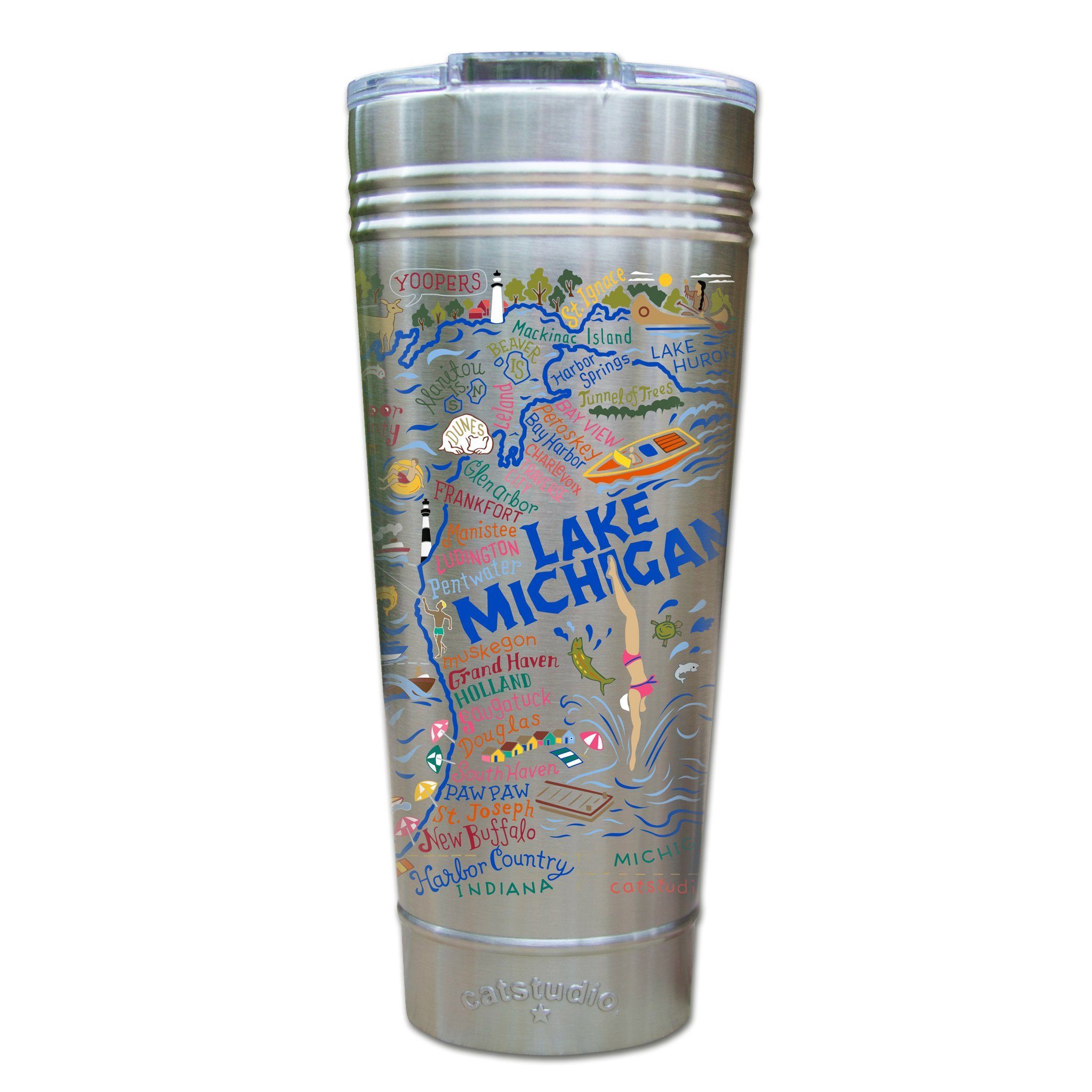 This original design celebrates Lake Michigan!Our original art is now available to bring along on all your on-the-go adventures. This triple-walled 24 ounce thermal tumbler amazingly keeps beverages HOT for 4 hours and COLD for 6 hours. Add ice for up to 12 hours of cool sipping! Features a thoughtfully-engineered magnetic closure and a non-slip bottom to prevent spills and wet marks on surfaces. Innovation at its finest. Yippee!
