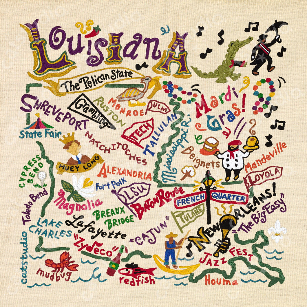 Louisiana—it's like a different country, but it's a state. This original design celebrates this amazing state from Lake Charles to Monroe to Tallulah to the Crescent City!