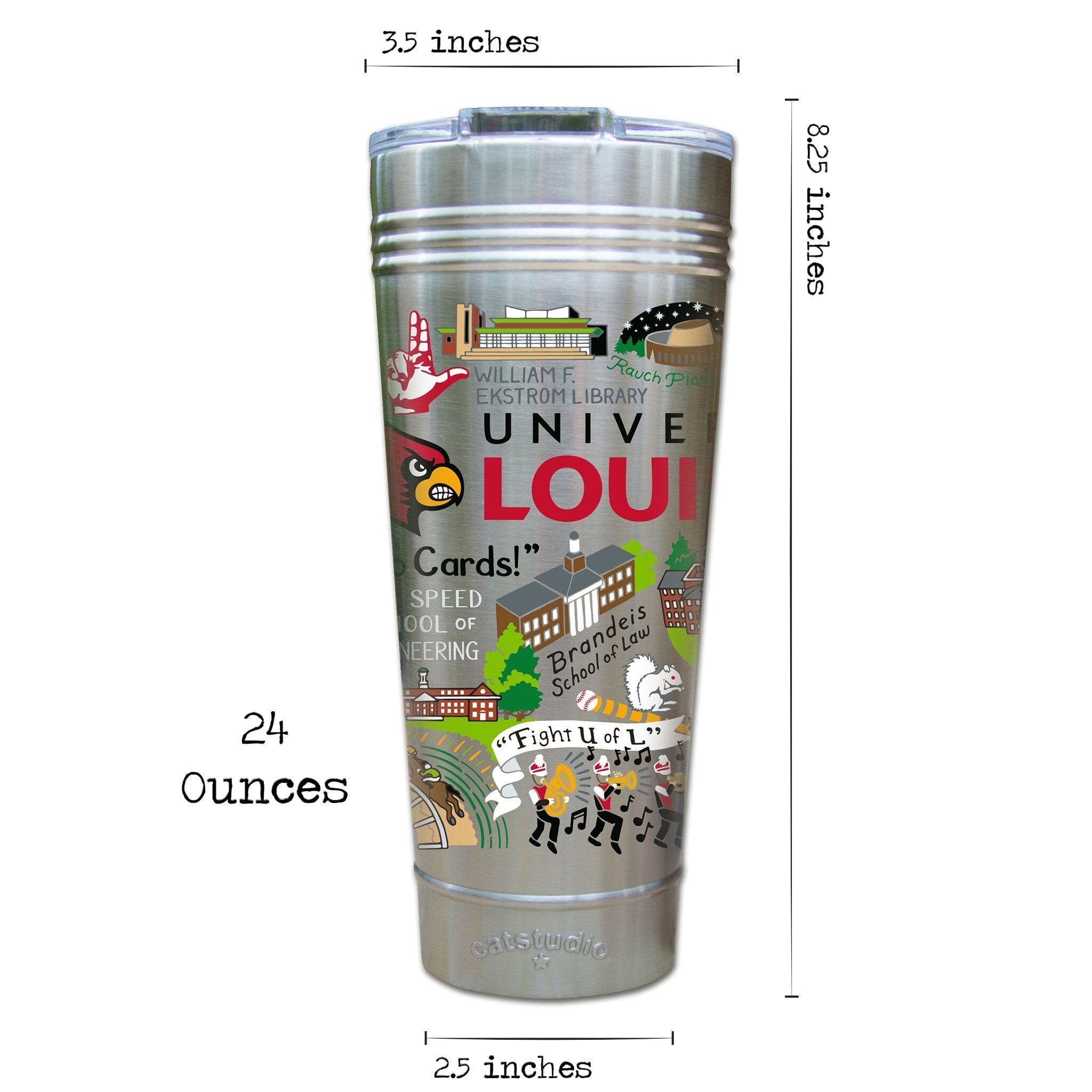 This original design celebrates the University of Louisville. Go Cards!Our original art is now available to bring along on all your on-the-go adventures. This triple-walled 24 ounce thermal tumbler amazingly keeps beverages HOT for 4 hours and COLD for 6 hours. Add ice for up to 12 hours of cool sipping! Features a thoughtfully-engineered magnetic closure and a non-slip bottom to prevent spills and wet marks on surfaces. Innovation at its finest. Yippee!