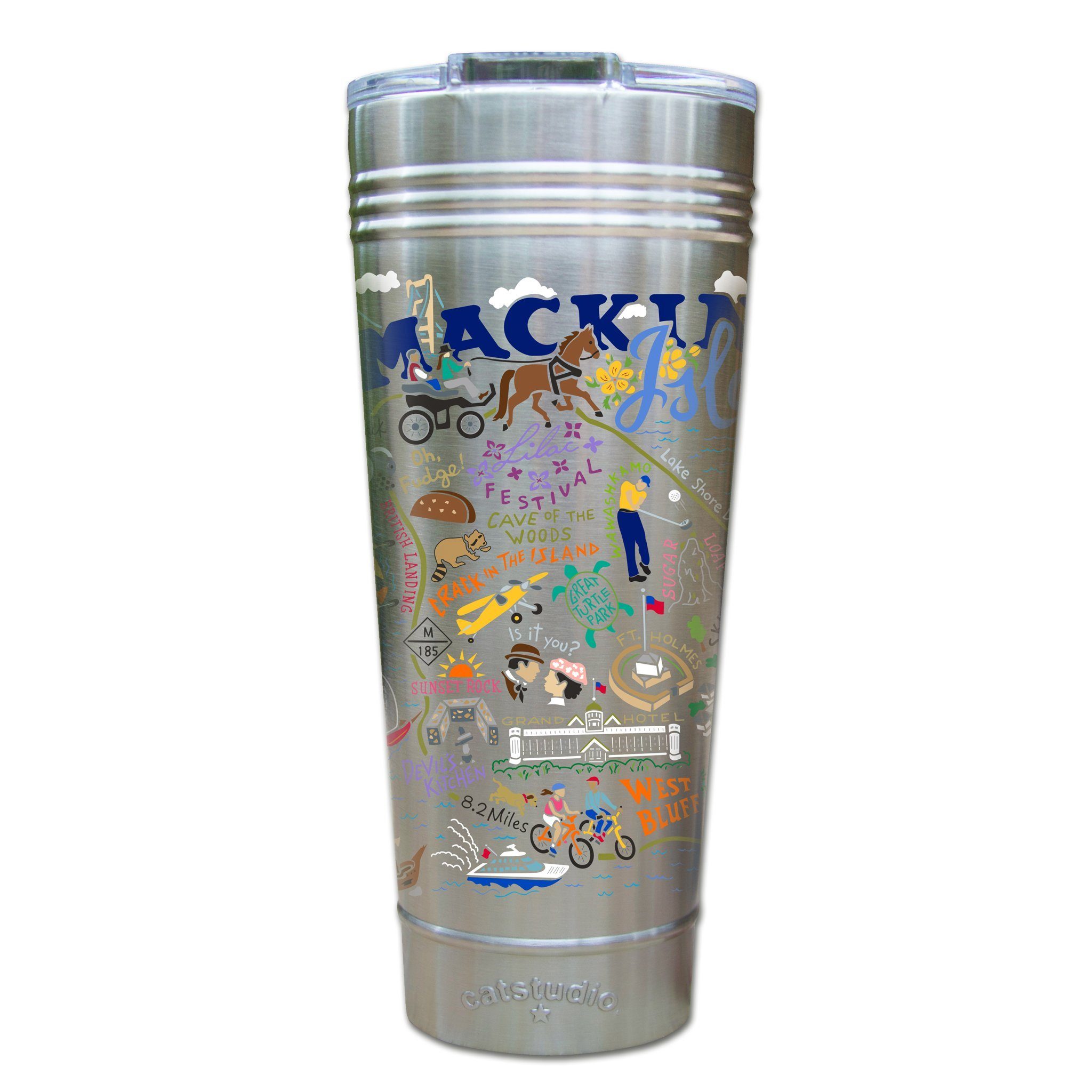 This original design celebrates all 8.2 miles of beautiful Mackinac Island, Michigan!Our original art is now available to bring along on all your on-the-go adventures. This triple-walled 24 ounce thermal tumbler amazingly keeps beverages HOT for 4 hours and COLD for 6 hours. Add ice for up to 12 hours of cool sipping! Features a thoughtfully-engineered magnetic closure and a non-slip bottom to prevent spills and wet marks on surfaces. Innovation at its finest. Yippee!