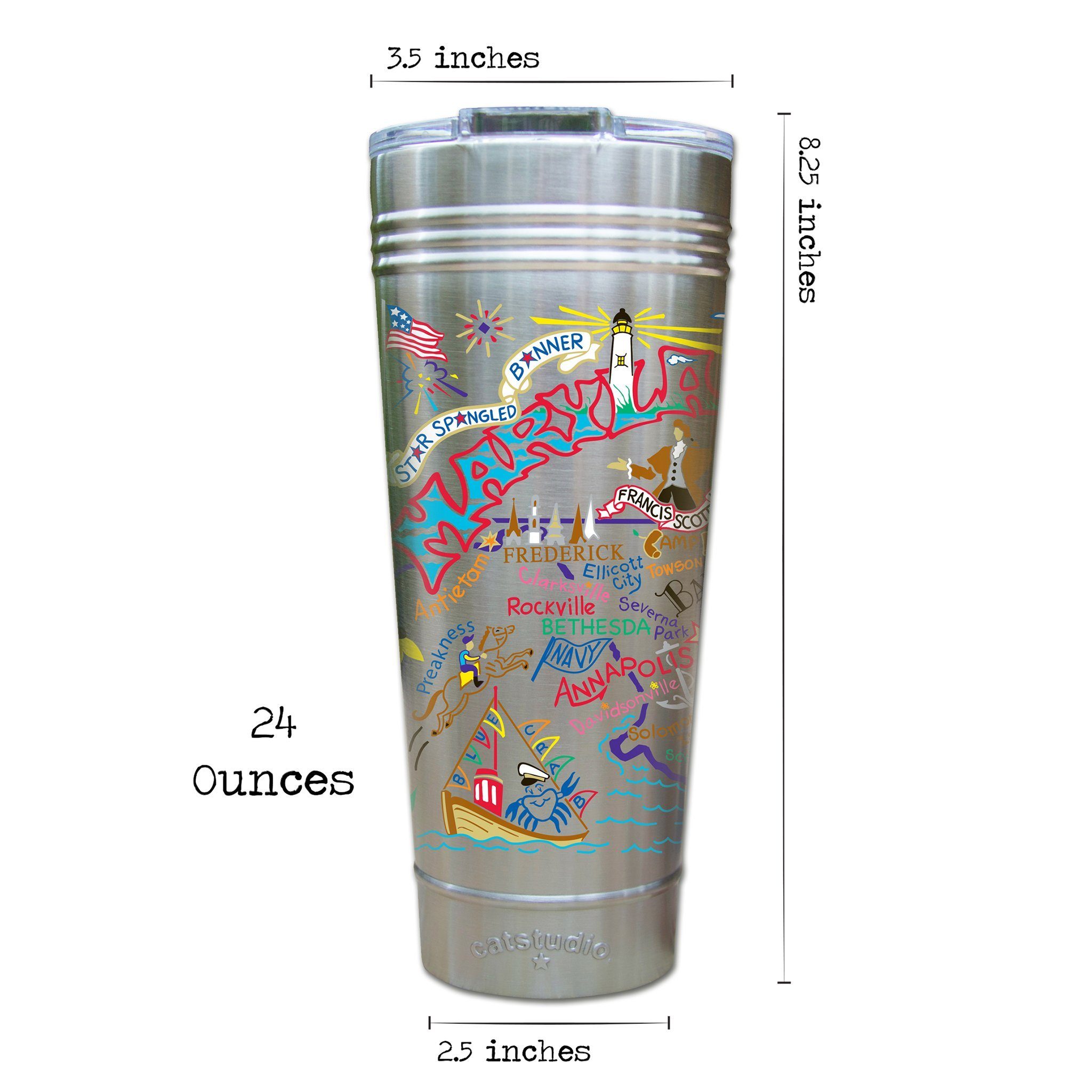 This original design celebrates the State of Maryland - from Camp David to the Chesapeake Bay to Ocean City (and Thrasher's Fries - of course)!Our original art is now available to bring along on all your on-the-go adventures. This triple-walled 24 ounce thermal tumbler amazingly keeps beverages HOT for 4 hours and COLD for 6 hours. Add ice for up to 12 hours of cool sipping! Features a thoughtfully-engineered magnetic closure and a non-slip bottom to prevent spills and wet marks on surfaces. Innovation at its finest. Yippee!