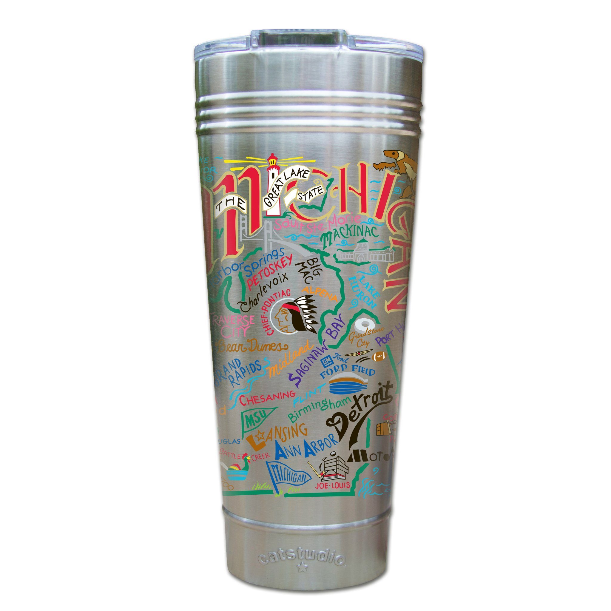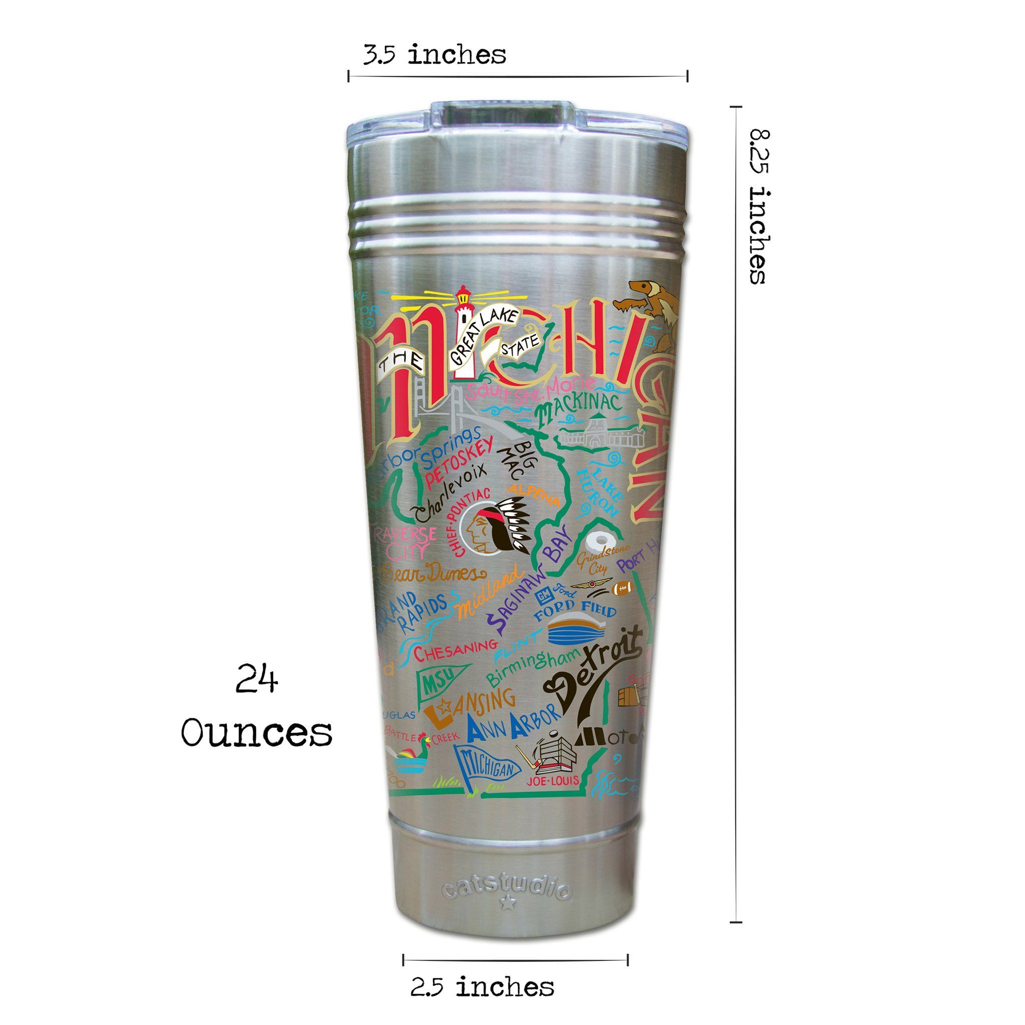 This original design celebrates the amazing State of Michigan in great detail - from Battle Creek to Holland (yes they have Tulips) to the Porcupine Mountains!!!Our original art is now available to bring along on all your on-the-go adventures. This triple-walled 24 ounce thermal tumbler amazingly keeps beverages HOT for 4 hours and COLD for 6 hours. Add ice for up to 12 hours of cool sipping! Features a thoughtfully-engineered magnetic closure and a non-slip bottom to prevent spills and wet marks on surfaces. Innovation at its finest. Yippee!