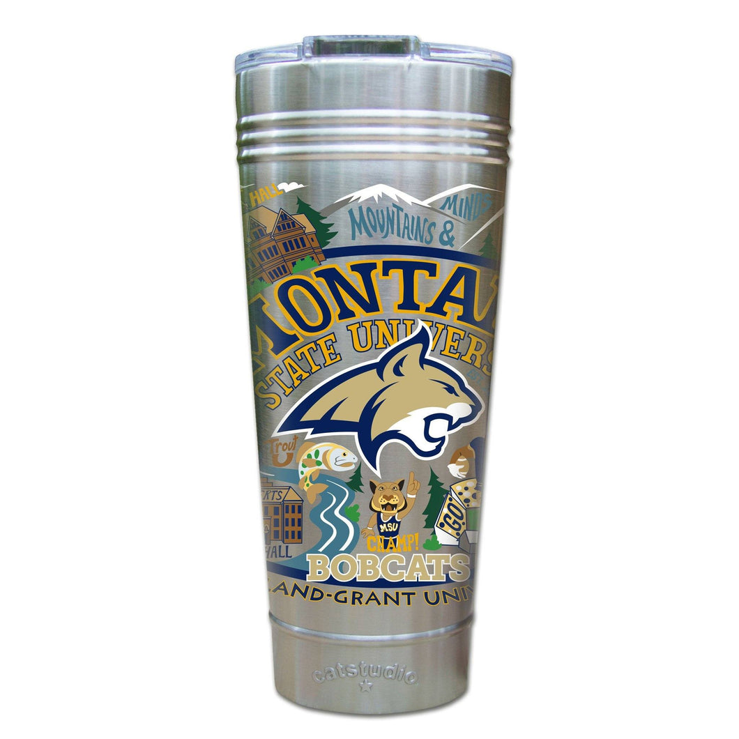 This original design celebrates Montana State University. Go Bobcats!Our original art is now available to bring along on all your on-the-go adventures. This triple-walled 24 ounce thermal tumbler amazingly keeps beverages HOT for 4 hours and COLD for 6 hours. Add ice for up to 12 hours of cool sipping! Features a thoughtfully-engineered magnetic closure and a non-slip bottom to prevent spills and wet marks on surfaces. Innovation at its finest. Yippee!