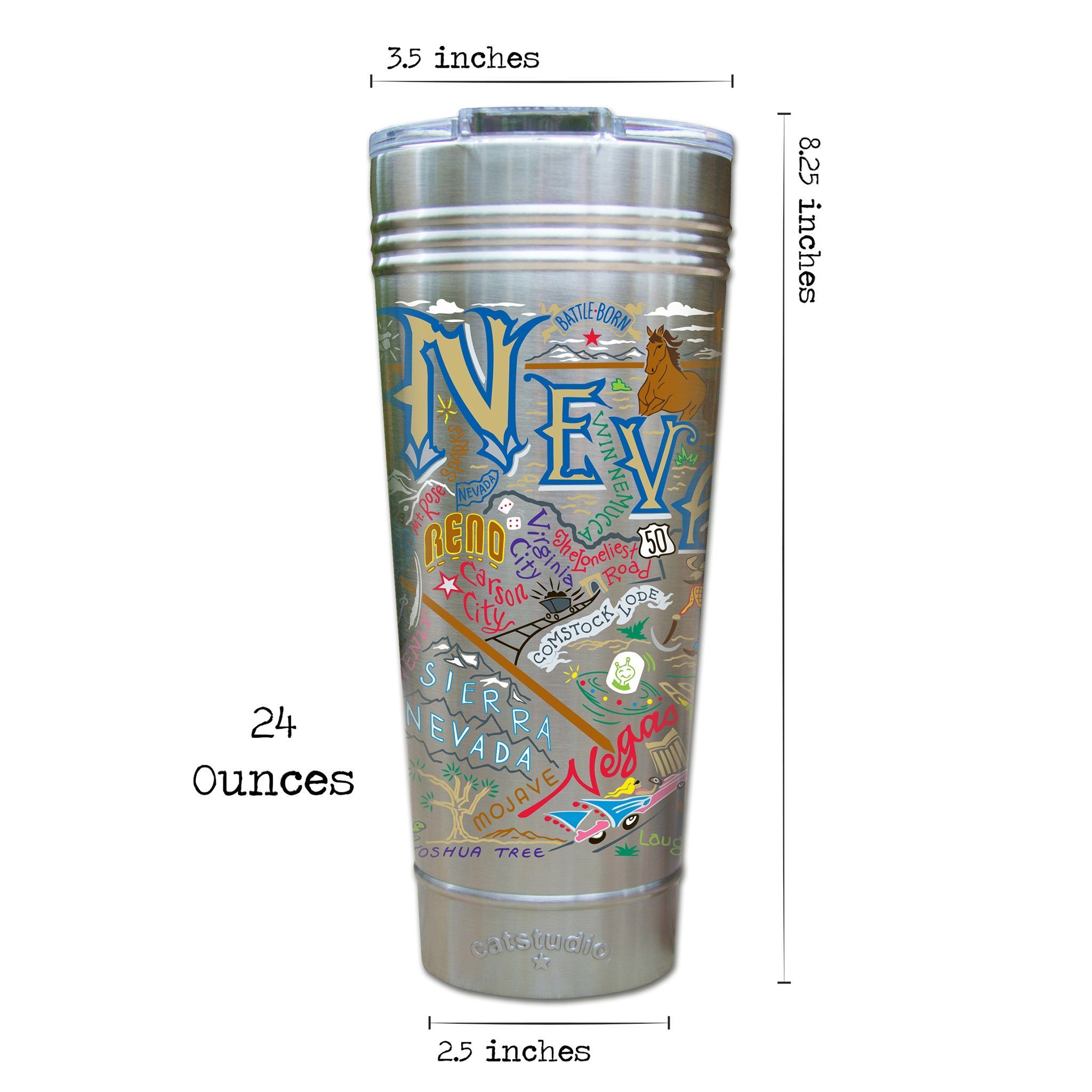 This original design celebrates the State of Nevada from Vegas to Lake Tahoe to Sparks and across America's loneliest highway - Hwy 50!!!Our original art is now available to bring along on all your on-the-go adventures. This triple-walled 24 ounce thermal tumbler amazingly keeps beverages HOT for 4 hours and COLD for 6 hours. Add ice for up to 12 hours of cool sipping! Features a thoughtfully-engineered magnetic closure and a non-slip bottom to prevent spills and wet marks on surfaces. Innovation at its finest. Yippee!