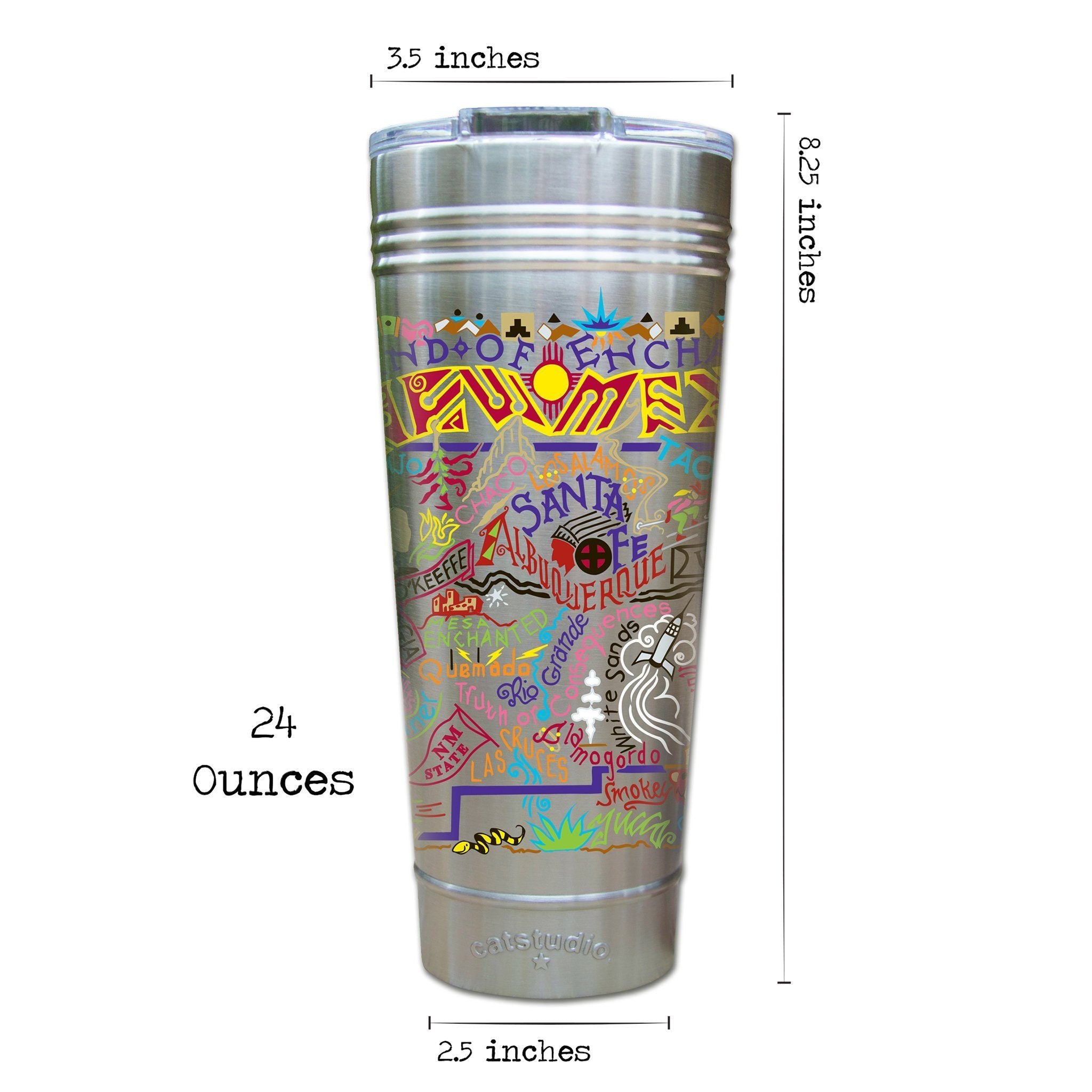 In beautiful detail this original design celebrates the State of New Mexico - from Carlsbad Caverns to White Sands to Gila Forrest to Anasazi to Mescalero - it truly is the LAND OF ENCHANTMENT!Our original art is now available to bring along on all your on-the-go adventures. This triple-walled 24 ounce thermal tumbler amazingly keeps beverages HOT for 4 hours and COLD for 6 hours. Add ice for up to 12 hours of cool sipping! Features a thoughtfully-engineered magnetic closure and a non-slip bottom to prevent spills and wet marks on surfaces. Innovation at its finest. Yippee!