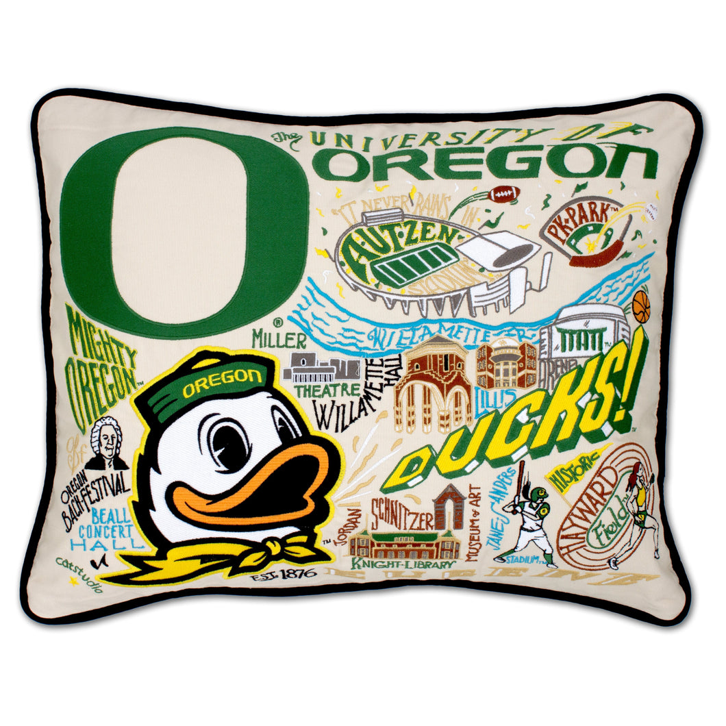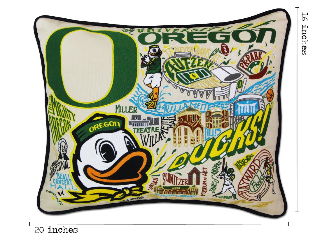 This pillow is embroidered with our original and licensed art. Created on tea-colored background, accented with black piping, and finished with a zipper closure. 16x20 inches.