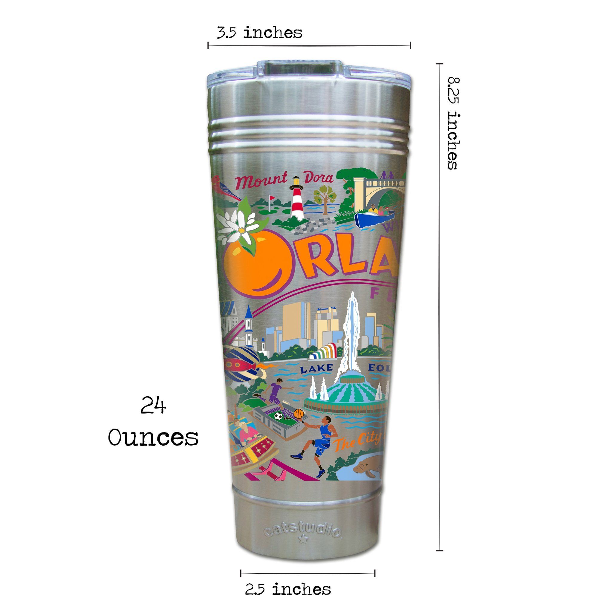 This original design celebrates the City of Orlando in exquisite detail! From St. John's River to Mayport. From Pont Vedra to the Landing...it's all here.Our original art is now available to bring along on all your on-the-go adventures. This triple-walled 24 ounce thermal tumbler amazingly keeps beverages HOT for 4 hours and COLD for 6 hours. Add ice for up to 12 hours of cool sipping! Features a thoughtfully-engineered magnetic closure and a non-slip bottom to prevent spills and wet marks on surfaces. Innovation at its finest. Yippee!