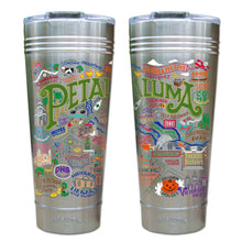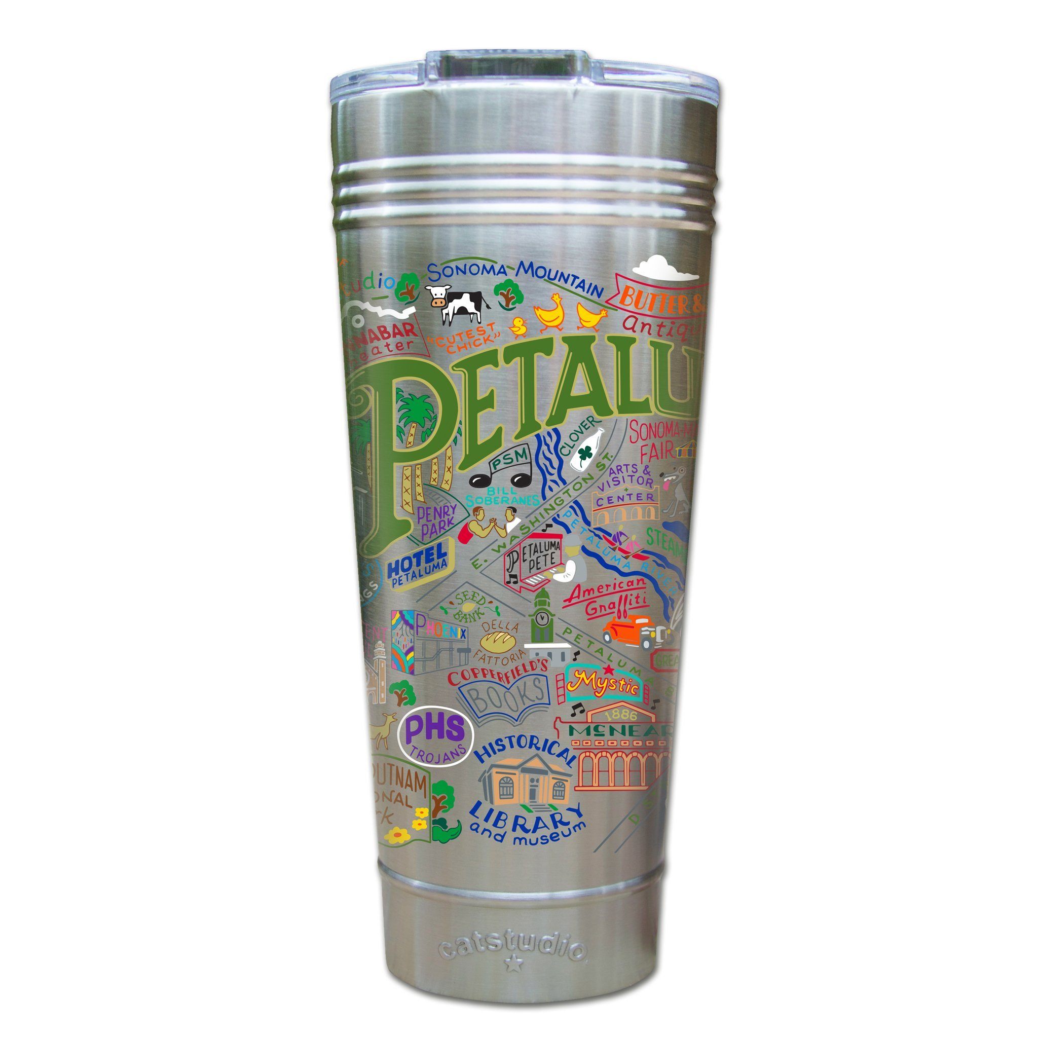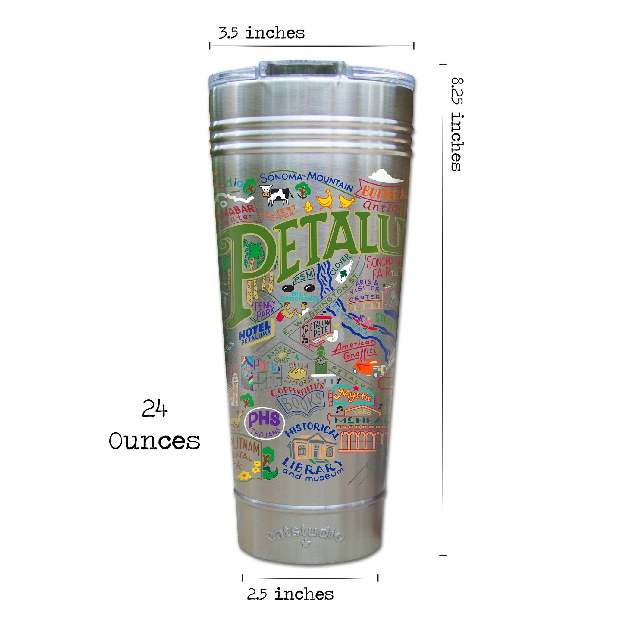 This original design celebrates Petaluma, CA - home of catstudio!Our original art is now available to bring along on all your on-the-go adventures. This triple-walled 24 ounce thermal tumbler amazingly keeps beverages HOT for 4 hours and COLD for 6 hours. Add ice for up to 12 hours of cool sipping! Features a thoughtfully-engineered magnetic closure and a non-slip bottom to prevent spills and wet marks on surfaces. Innovation at its finest. Yippee!