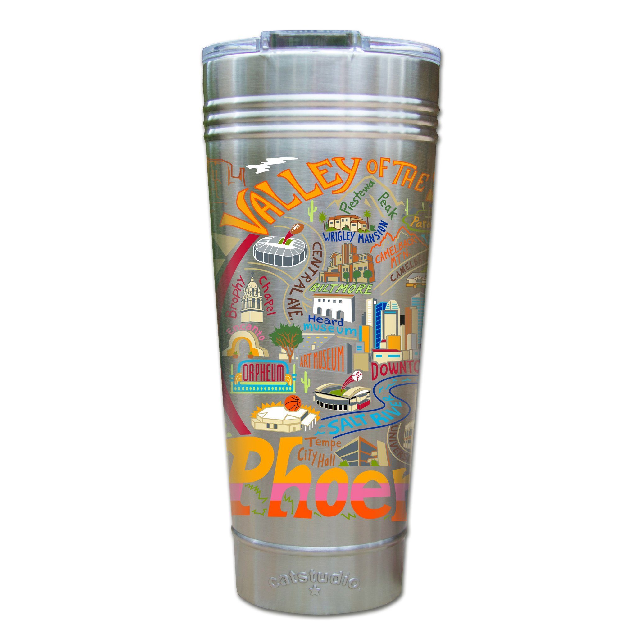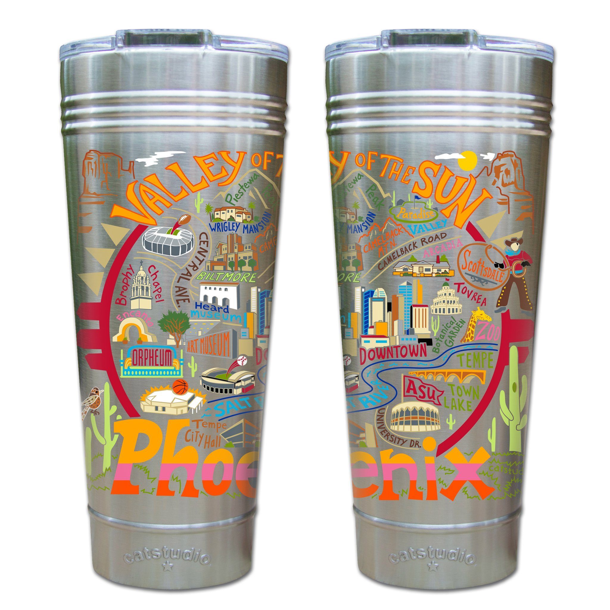 This original design celebrates the Valley of the Sun - Phoenix, Arizona!Our original art is now available to bring along on all your on-the-go adventures. This triple-walled 24 ounce thermal tumbler amazingly keeps beverages HOT for 4 hours and COLD for 6 hours. Add ice for up to 12 hours of cool sipping! Features a thoughtfully-engineered magnetic closure and a non-slip bottom to prevent spills and wet marks on surfaces. Innovation at its finest. Yippee!