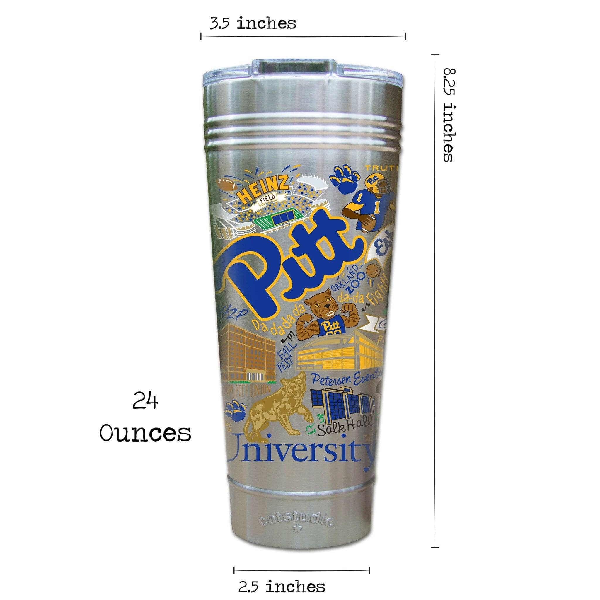 This original design celebrates the University of Pittsburgh. Go Panthers!Our original art is now available to bring along on all your on-the-go adventures. This triple-walled 24 ounce thermal tumbler amazingly keeps beverages HOT for 4 hours and COLD for 6 hours. Add ice for up to 12 hours of cool sipping! Features a thoughtfully-engineered magnetic closure and a non-slip bottom to prevent spills and wet marks on surfaces. Innovation at its finest. Yippee!