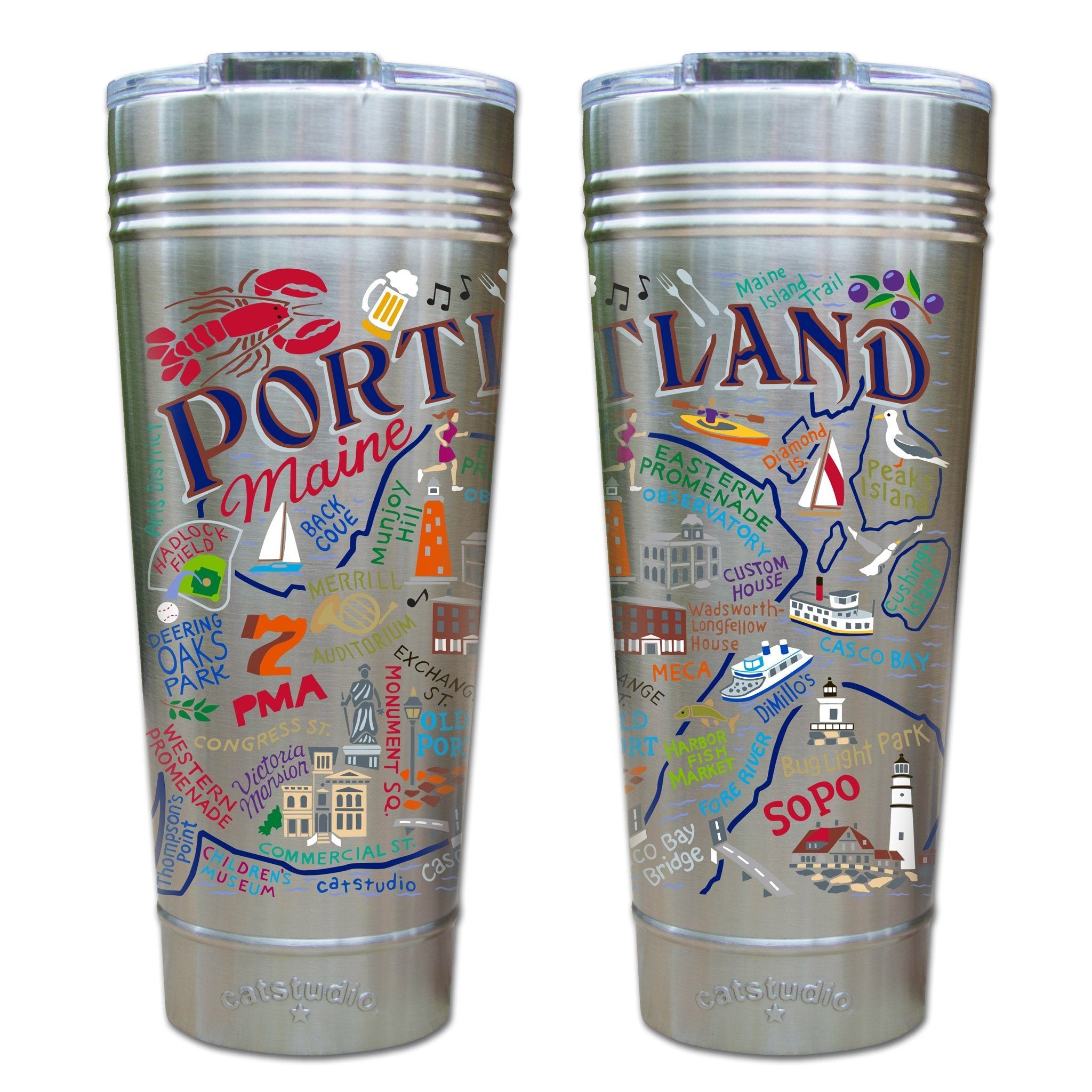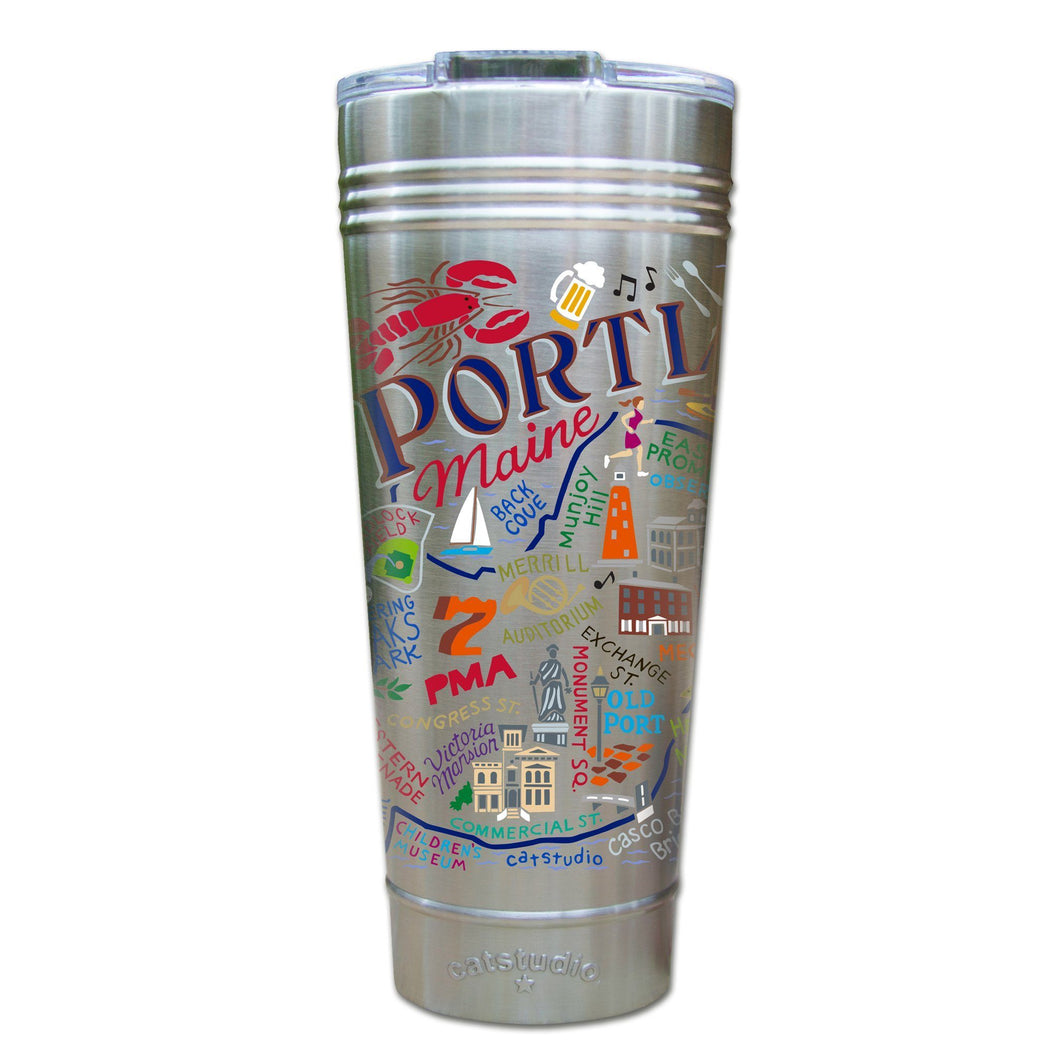 This original design celebrates Portland, Maine!Our original art is now available to bring along on all your on-the-go adventures. This triple-walled 24 ounce thermal tumbler amazingly keeps beverages HOT for 4 hours and COLD for 6 hours. Add ice for up to 12 hours of cool sipping! Features a thoughtfully-engineered magnetic closure and a non-slip bottom to prevent spills and wet marks on surfaces. Innovation at its finest. Yippee!