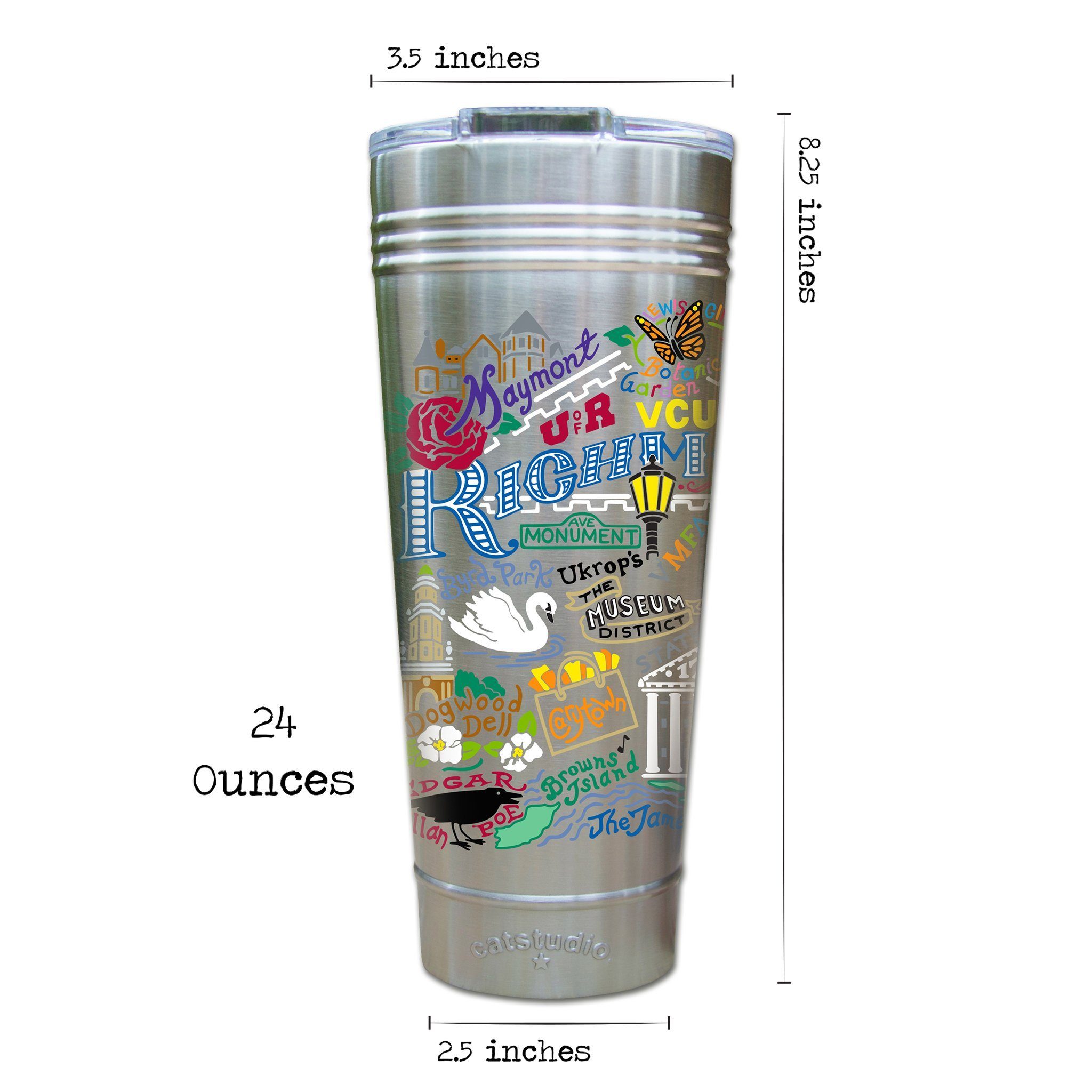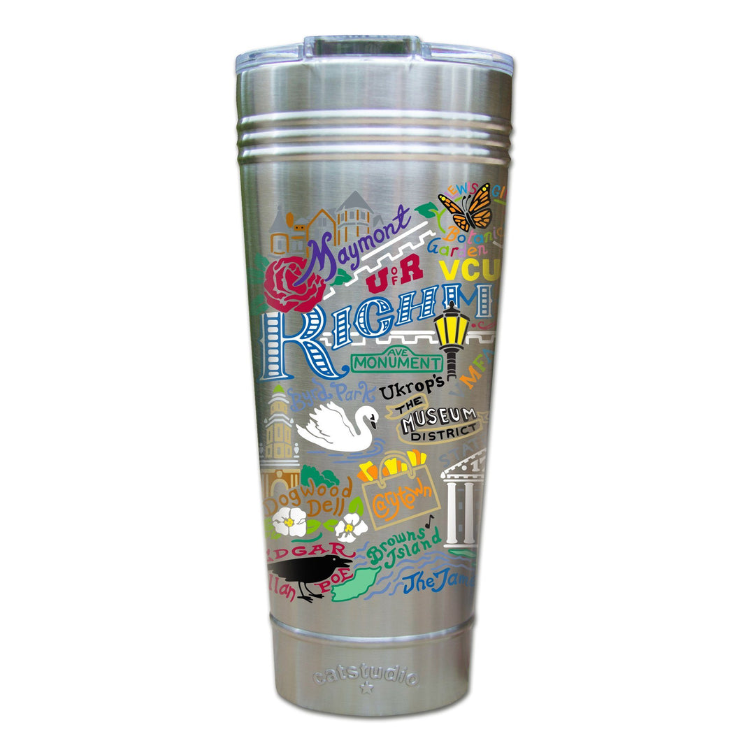Give me liberty or give me death! This original design celebrates the City of Richmond, Virginia.Our original art is now available to bring along on all your on-the-go adventures. This triple-walled 24 ounce thermal tumbler amazingly keeps beverages HOT for 4 hours and COLD for 6 hours. Add ice for up to 12 hours of cool sipping! Features a thoughtfully-engineered magnetic closure and a non-slip bottom to prevent spills and wet marks on surfaces. Innovation at its finest. Yippee!