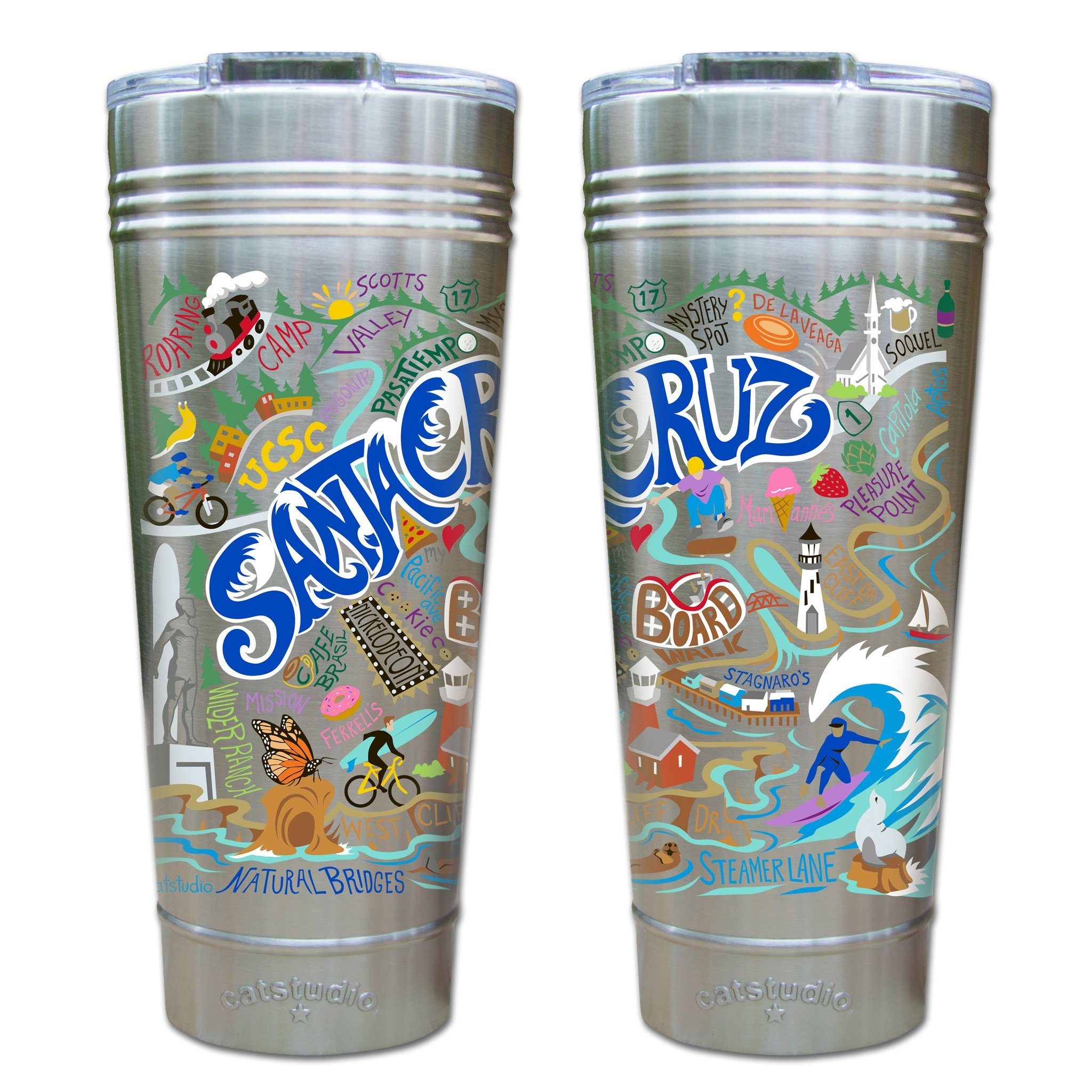 This original design celebrates Santa Cruz, California!Our original art is now available to bring along on all your on-the-go adventures. This triple-walled 24 ounce thermal tumbler amazingly keeps beverages HOT for 4 hours and COLD for 6 hours. Add ice for up to 12 hours of cool sipping! Features a thoughtfully-engineered magnetic closure and a non-slip bottom to prevent spills and wet marks on surfaces. Innovation at its finest. Yippee!