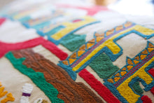 This pillow is entirely EMBROIDERED by HAND on 100% Organic Cotton. Amazingly, it can take up to one week to embroider one pillow! It is also unique in nature since each artisan incorporates a certain flair to their work, and every piece is signed on the tag. Created on tea-colored background, accented with black velvet piping, and finished with a 3-button closure. 20 x 20 inches.