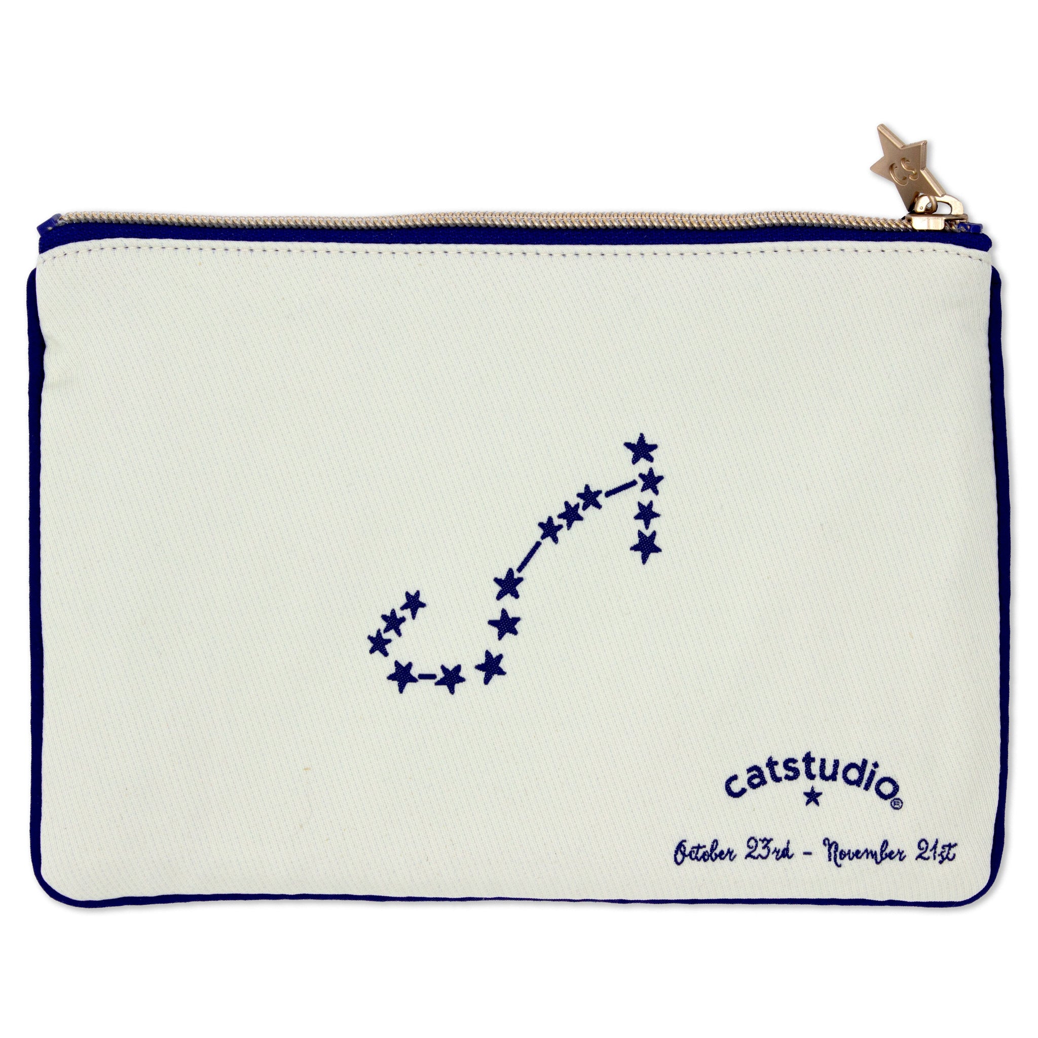 Our original design is uniquely woven (not printed!) with enchanting silver and gold threads into a handy-sized zip pouch - perfect for toting your keys, cash & credit cards, cosmetics - all your small necessities! Complete with chic gold zipper and star pull, and our signature constellation navy blue lining. Conveniently sized at 5.5x8 inches.