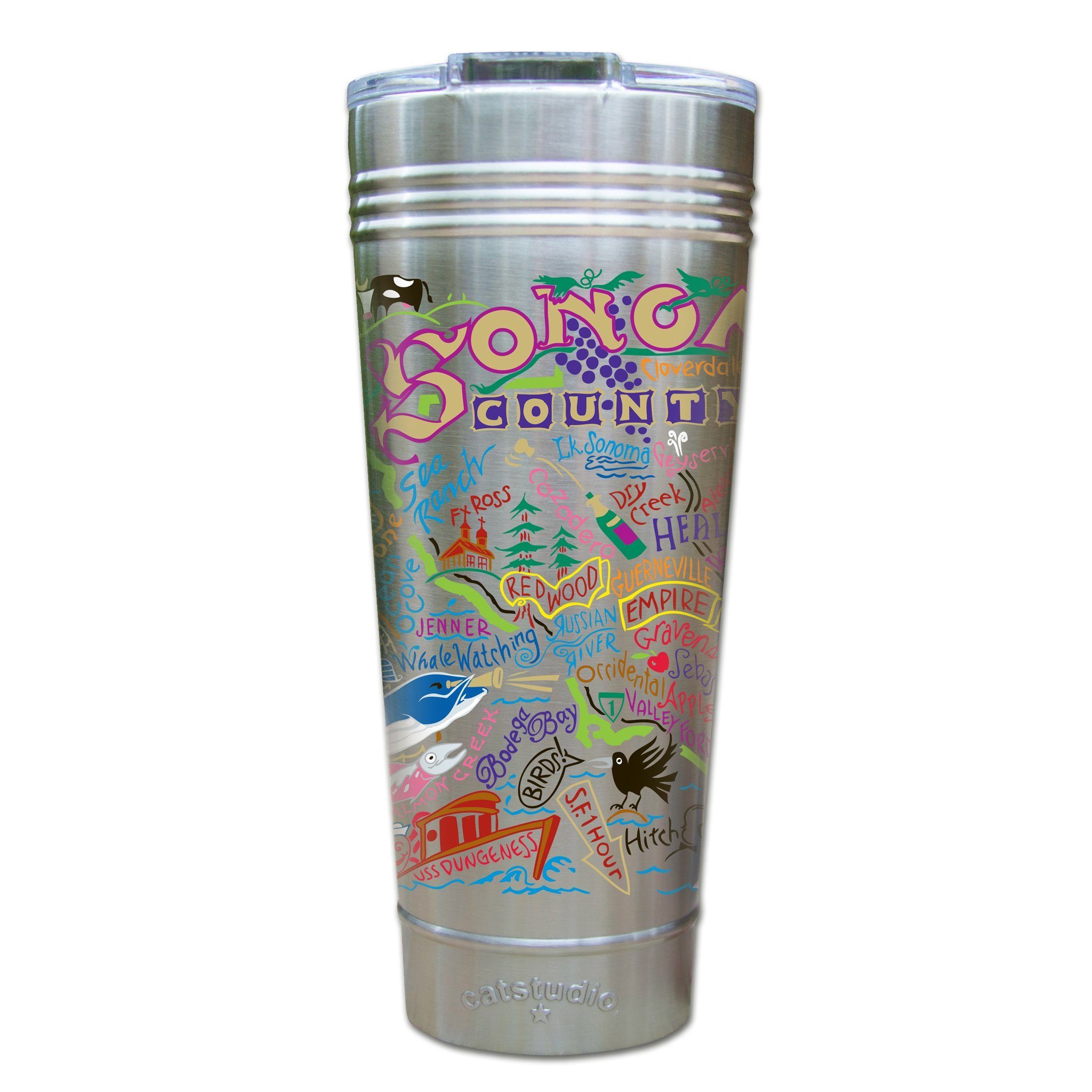 Home to Charles Schultz, Jack London, and catstudio(!), and the set of many Alfred Hitchcock films, this original design celebrates Sonoma County.Our original art is now available to bring along on all your on-the-go adventures. This triple-walled 24 ounce thermal tumbler amazingly keeps beverages HOT for 4 hours and COLD for 6 hours. Add ice for up to 12 hours of cool sipping! Features a thoughtfully-engineered magnetic closure and a non-slip bottom to prevent spills and wet marks on surfaces. Innovation at its finest. Yippee!