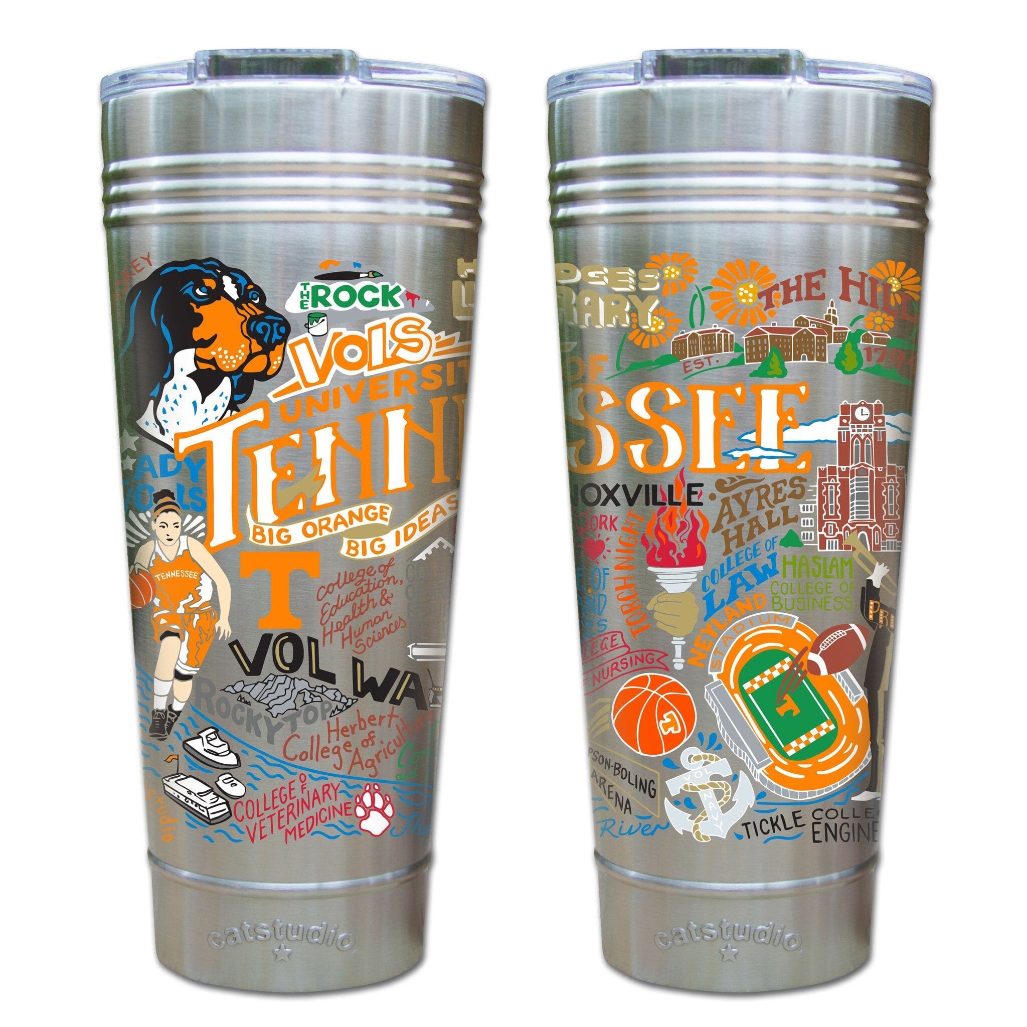 This original design celebrates the University of Tennessee. Go Vols!Our original art is now available to bring along on all your on-the-go adventures. This triple-walled 24 ounce thermal tumbler amazingly keeps beverages HOT for 4 hours and COLD for 6 hours. Add ice for up to 12 hours of cool sipping! Features a thoughtfully-engineered magnetic closure and a non-slip bottom to prevent spills and wet marks on surfaces. Innovation at its finest. Yippee!