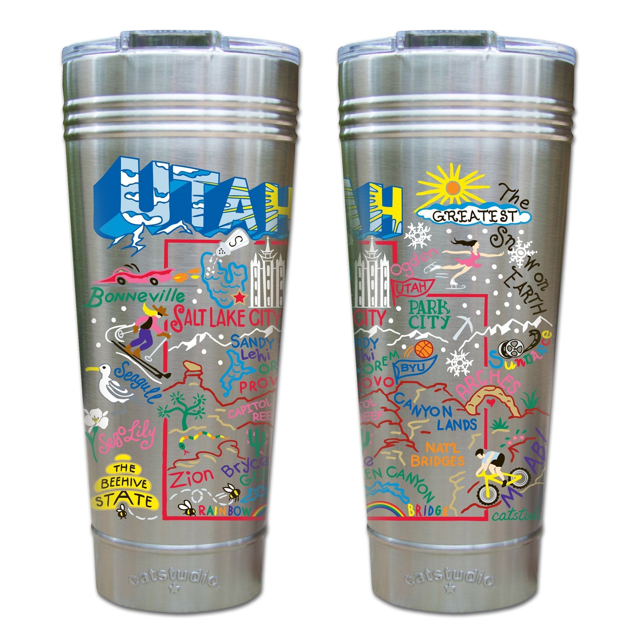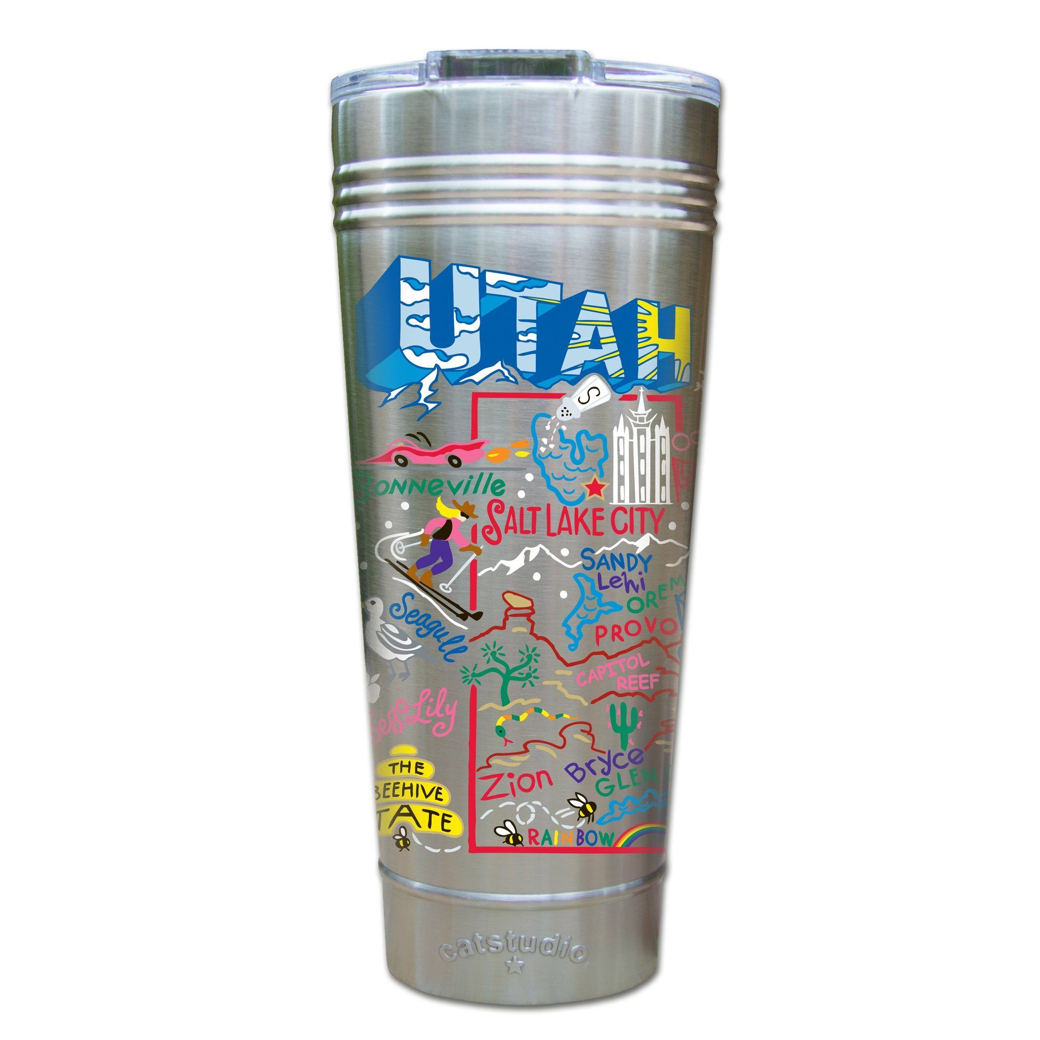 The Beehive State! This original design celebrates the State of Utah.Our original art is now available to bring along on all your on-the-go adventures. This triple-walled 24 ounce thermal tumbler amazingly keeps beverages HOT for 4 hours and COLD for 6 hours. Add ice for up to 12 hours of cool sipping! Features a thoughtfully-engineered magnetic closure and a non-slip bottom to prevent spills and wet marks on surfaces. Innovation at its finest. Yippee!