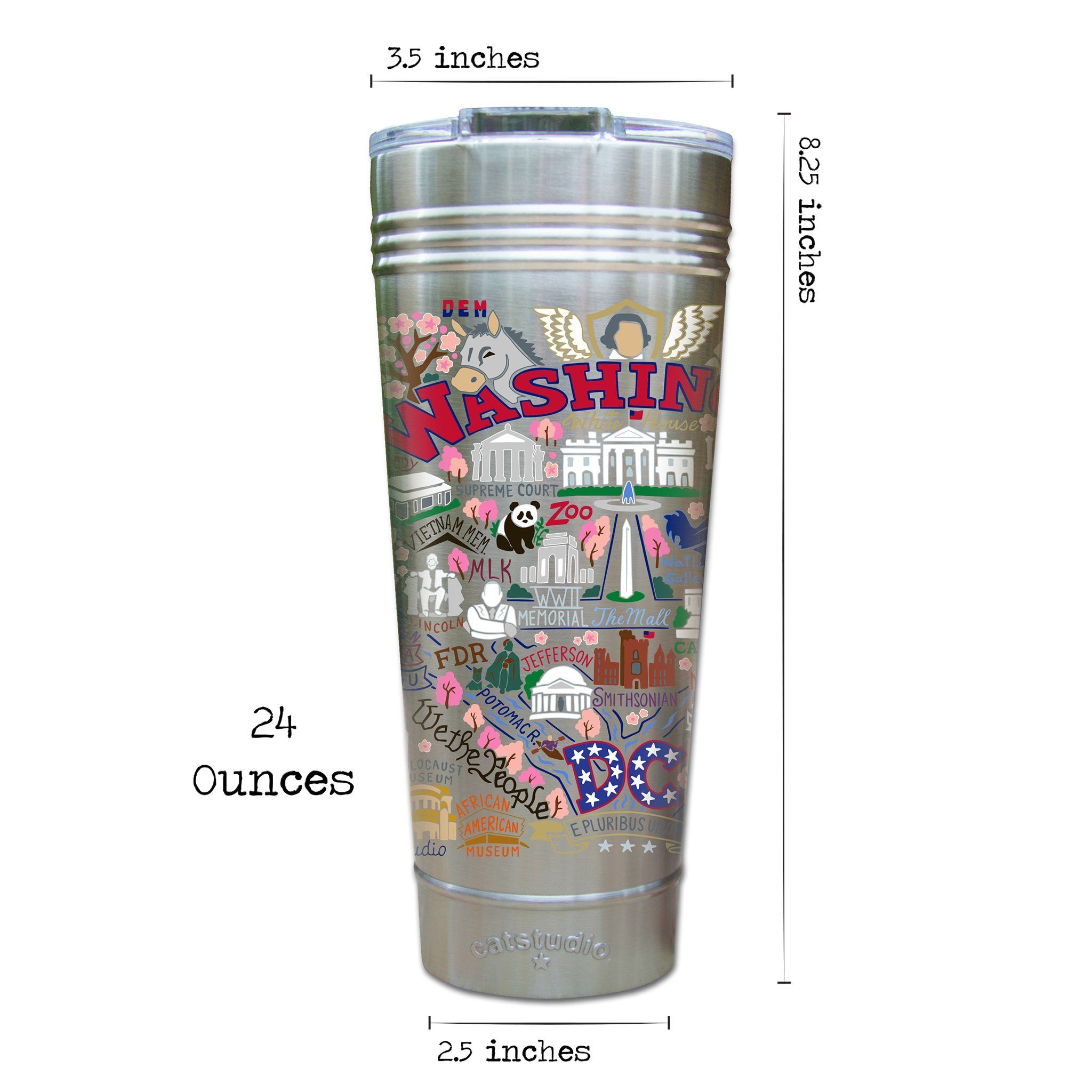 This original design celebrates our Nation's Capital - Washington DC!Our original art is now available to bring along on all your on-the-go adventures. This triple-walled 24 ounce thermal tumbler amazingly keeps beverages HOT for 4 hours and COLD for 6 hours. Add ice for up to 12 hours of cool sipping! Features a thoughtfully-engineered magnetic closure and a non-slip bottom to prevent spills and wet marks on surfaces. Innovation at its finest. Yippee!