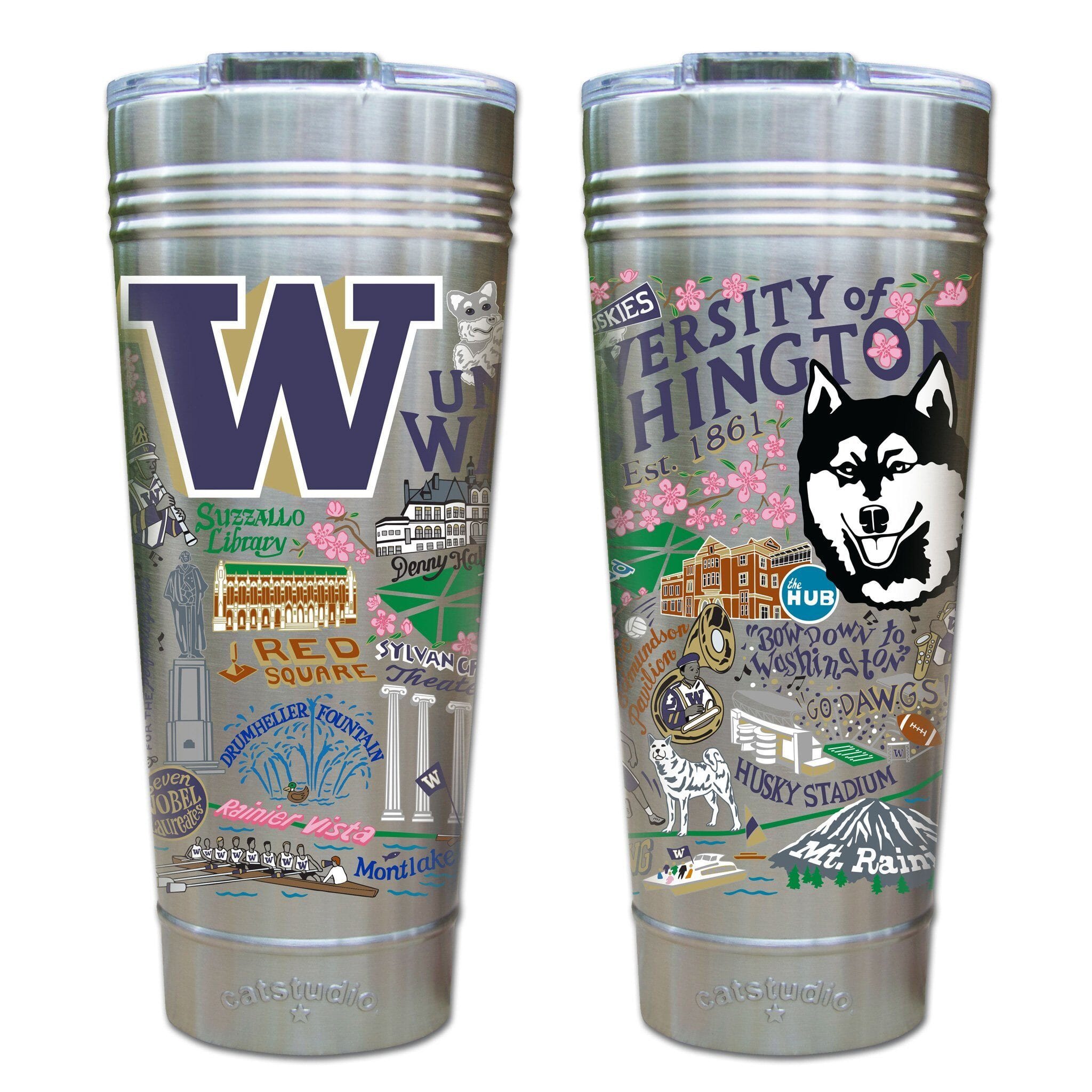 This original design celebrates the University of Washington. Go Huskies!Our original art is now available to bring along on all your on-the-go adventures. This triple-walled 24 ounce thermal tumbler amazingly keeps beverages HOT for 4 hours and COLD for 6 hours. Add ice for up to 12 hours of cool sipping! Features a thoughtfully-engineered magnetic closure and a non-slip bottom to prevent spills and wet marks on surfaces. Innovation at its finest. Yippee!