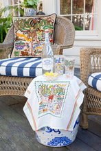 Our original design is printed using the labor intensive hand-swipe silk-screen process with 12 colors (that's 12 screens used for each towel!). The design is framed with a hand-embroidered border on a 100% hand-loomed cotton towel generously sized at 20x29 inches. Three cheery woven stripes run down both sides and hand-dyed rick-rack at the top and bottom add a charming vintage touch. All this delightfully presented in a fab organdy re-usable pouch ready for gifting!